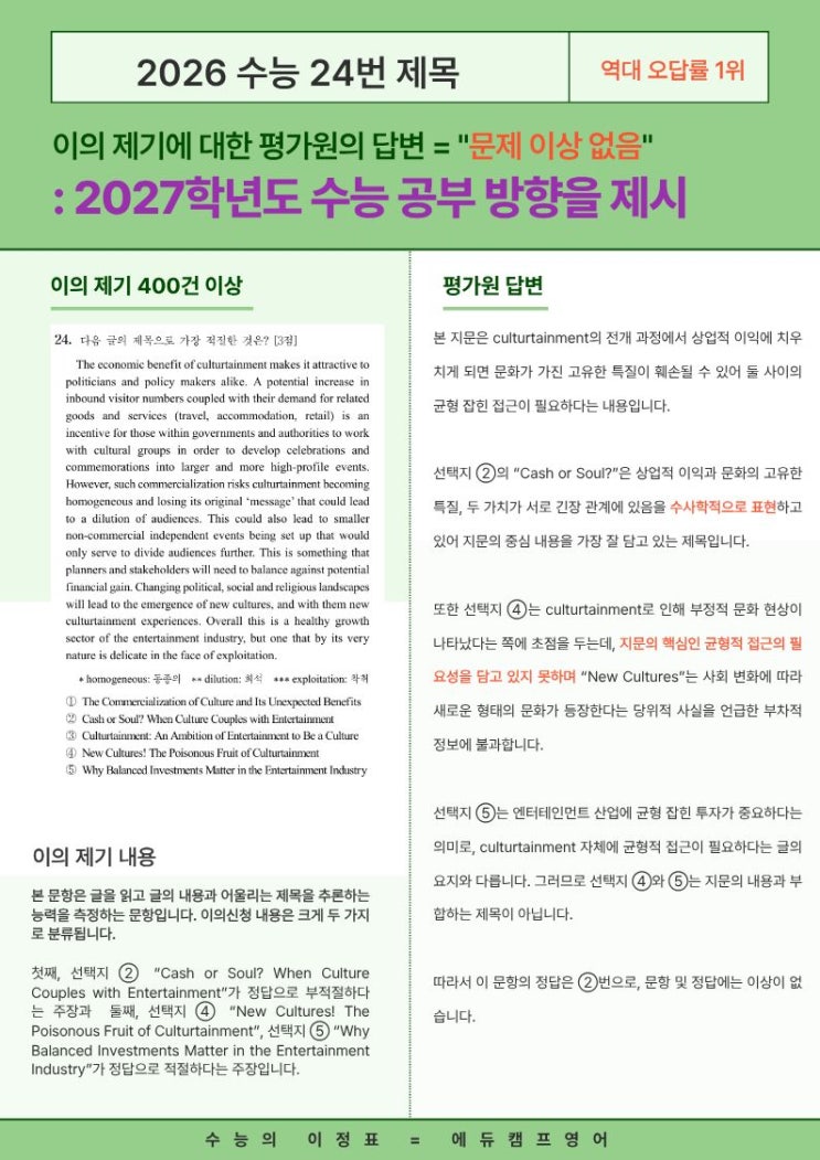 #에듀캠프 #2026수능 #수능제목문제 #수능제목이의제기 #제목문제접근법 #2027수능공부방향 #2027수능영어 #포괄적선지 #역대오답률1위제목 영어도 수학도 역시 에듀캠프 ※ 특강 신청 및 문의 ☎ 010-3674-8750 (대표원장 직통번호) ※ 현재 고2 기존 특강을 수강하는 재원생은 따로 신청하지 않고, 단계별로 계속 이어서 수강하시면 됩니다. <img src="https://blogthumb.pstatic.net/MjAyNTEyMTFfMTI3/MDAxNzY1NDQyODI3MTA1.lEBvqLrjeIAytp_qiE3ROR2eJiSEK79T8Y0kdS5cPdYg._qXKNr9rtFLz8H69Fex9G0dzPDO1SgvKrFiOyEzSykcg.JPEG/1.jpg?type=s3" />