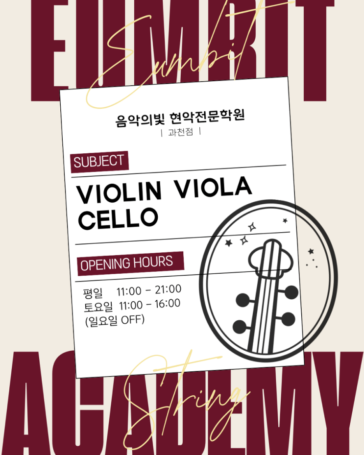 빛나는 우리의 행복 음악의빛✨ 현악전문학원 -과천점 안녕하세요. 음악의빛 대표원장 이혜림입니다 :) 현악기 시작하기, 어떤 수업을 들어야 할지 고민 중이라면? 바이올린, 비올라, 첼로까지 전문적인 현악 교육이 가능한 ‘음악의빛’에서 나에게 맞는 악기를 찾아보세요 ♀️ “음악의빛 현악전문학원은 왜 인기가 높을까요?” 1 저희는 바이올린, 비올라, 첼로 각 악기를 전공한 전문 선생님만 수업합니다. > 한예종 출신, 예고 출강 중인 바이올린 전공 대표원장님과 한예종 출신 전공•입시반 강사진 > 음대 석사 졸업한 현악 전공 음악의빛 강사진! 아이에게 필요한 건 “악기를 조금 다뤄본 사람”이 아니라, 악기를....... <img src="https://blogthumb.pstatic.net/MjAyNTEyMTNfMjQ2/MDAxNzY1NjE1MDUxMDQ4.YvFfura4y6nRCLBzpV2z_qpk3Q3r_L6QXgxgs4zFI1Eg.GIIAp0z7A6Di29vJsjrfIN0ivRCXLEhaIhh0cL-l4lIg.PNG/%B0%FA%C3%B5%C1%A1_%BD%BA%C4%C9%C1%D9%A3%A8%C0%CE%BD%BA%C5%B8%B1%D7%B7%A5_%B0%D4%BD%C3%B9%B0%A3%A845%A3%A9%A3%A9%C0%C7_%BB%E7%BA%BB_%A3%AD_1.png?type=s3" />