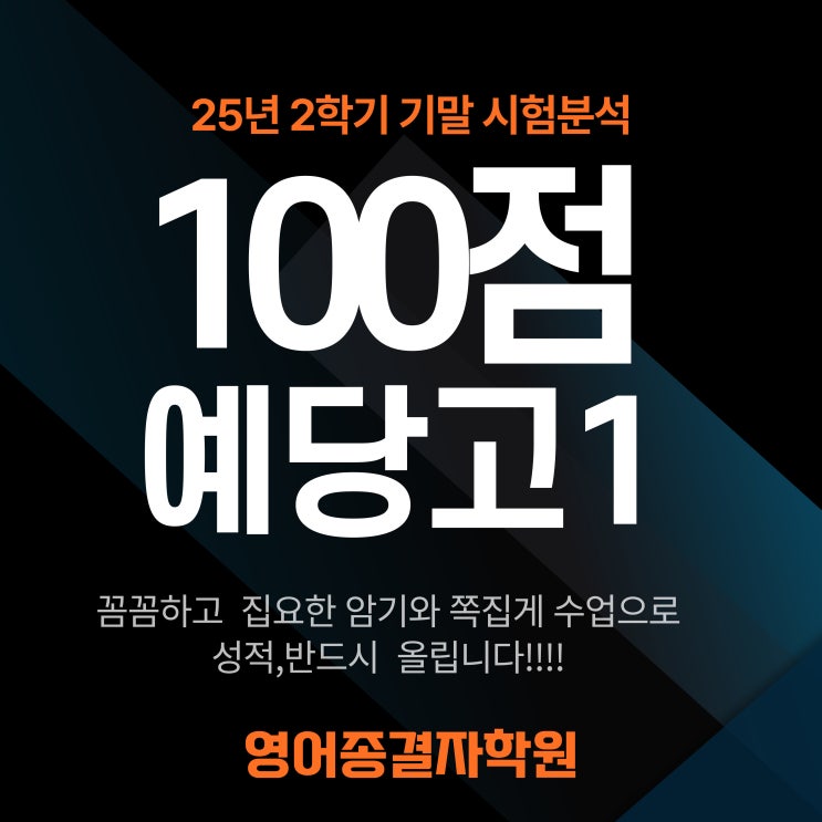 영어종결자 학원 예당고 1학년 재원생들이 2학기 기말고사 영어시험에서 100점,97점,95점을 맞았습니다. 100점을 맞을 수 있는 예당고 공부방법을 알아보겠습니다. 예당고 1학년 2025 2학기 기말고사 영어 시험은 교과서 2과& 올림포스,모고 지문 갯수가 총 21개로 시험범위가 많지 않아 영어종결자 학원은 예당고 시험대비를 지문 암기를 포함하여 좀더 꼼꼼하하고 세밀한 시험 대비로 진행 하였습니다. 예당고1 #영어시험의 난이도와 출제경향 시험대비 전략을 통해 영어종결자 학원 만의 좀더 효과적인 영어공부 방법을 알아보도록 하겠습니다. 2025 예당고1-2 #기말영어 출제경향과 난이도전략 출제범위와 내용 1. 2025 #예당고 1학년 #기....... <img src="https://blogthumb.pstatic.net/MjAyNTEyMTFfMTc3/MDAxNzY1NDU3NTQ2MTQw.UfDvaRixvheyQyP6hqGPNprmSSU8NVbADJa5uV329eEg.OPQZ_xudraONnxSvky3K_PNtS1WLCd7lVLzXn5kPfZUg.JPEG/%C1%A6%B8%F1%C0%BB-%C0%D4%B7%C2%C7%D8%C1%D6%BC%BC%BF%E4_-001_%2863%29.jpg?type=s3" />