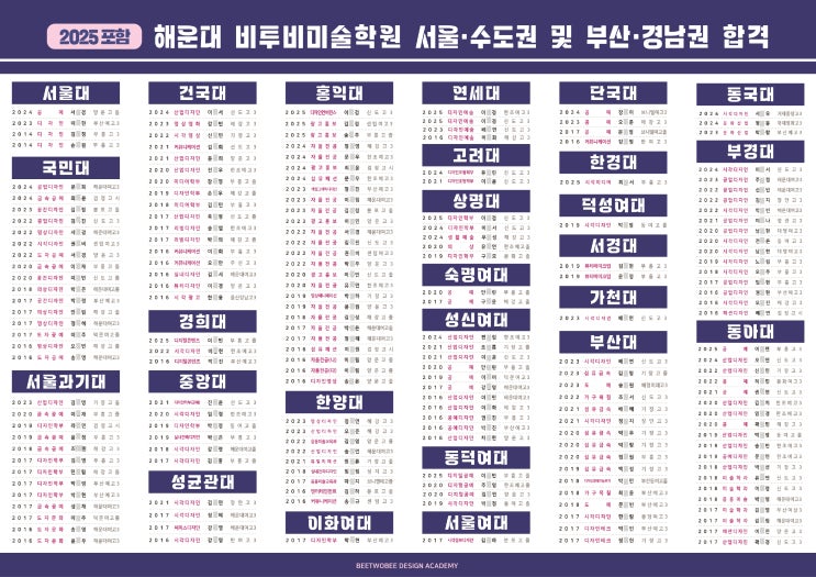 미대 입시를 준비하는 학생·학부모님들이 학원을 선택할 때 가장 중요하게 보는 기준은 바로 실제 합격 실적입니다. 해운대 비투비미술학원은 지난 2005년부터 20년동 동안 다양한 미대 전공에서 의미 있는 성과를 꾸준히 만들어 왔습니다. 아래에서는 2016~2025년까지의 누적 미대 합격자 명단을 정리하여 소개합니다. (※ 2026학년도 수시 결과는 현재 발표 중이며, 추후 업데이트될 예정입니다.) -비투비 전체명단이 아닌 해운대 비투비에서만 합격한 결과입니다- 해운대비투비미술학원이 20년 이상 안정적인 결과를 만들어낸 핵심에는 담임제 시스템 (중등, 예고입시, 고1,고2,고3,기초소양반 각각 전문적으로관리) 실기력 기반의 기초 훈련....... <img src="https://blogthumb.pstatic.net/MjAyNTExMTdfODkg/MDAxNzYzMzYxNDAzNDYz.qJNhEN5VnKfnsSE8utq4EVVsBeC3pJmjHyFTuJbDipwg.JaGbAbrDJT8JY5cJ78KQFeK9BK5vu4fcVSN_vWZLh8gg.JPEG/%C7%D5%B0%DD%C0%DA%B8%ED%B4%DC%BC%F6%C1%A4-01.jpg?type=s3" />