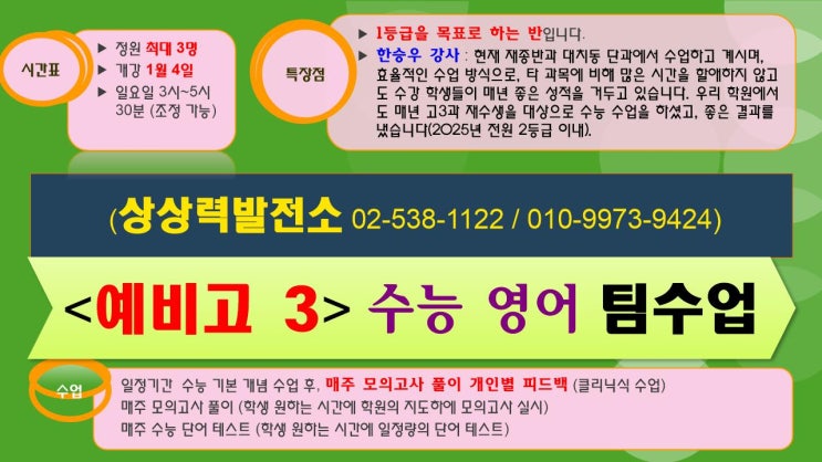 <예비고3> 영어 수업 안내입니다. <img src="https://blogthumb.pstatic.net/MjAyNTEyMTNfMzUg/MDAxNzY1NjIwNTUxMzM1.gZYziiQ00-XRn1cI1W2BjdL1kBxIXntkFAL9DPoXnxAg.t0qPk-rdS776TXrVH3uJcv2XD5vmQWAkEiPLNF-LFWYg.JPEG/%B0%ED3_%BF%B5%BE%EE.jpg?type=s3" />