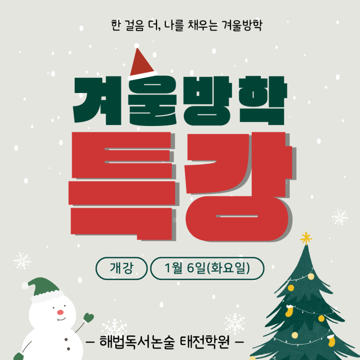 2026 해법독서논술 태전학원 겨울방학 오전 특강 소식을 전합니다. 매년 어머니들의 문의로 먼저 시작되는 인기 프로그램으로 이번 겨울방학에도 새 학년을 미리 준비할 수 있도록 알차게 구성했습니다. 벌써부터 특강 예약이 폭주!! 왜 특강 맛집인지 궁금하신 분들은 지금부터 주목해 주세요~!! 1. 저학년 전래동화 논술 저학년 친구들이 좋아하는 이야기보따리 전래동화를 바탕으로 쉽게 다가가는 수업입니다. 이야기 구조 이해 → 생각 질문 → 말하기 → 글쓰기까지 자연스럽게 이어지는 글쓰기 수업입니다. 동화 속 등장인물을 이해하고 공감력과 추론력을 올려줍니다. - 대상: 예비 2·3학년 - 시간: 금요일 10:30–12:00 (총 8회) 2. 인물....... <img src="https://blogthumb.pstatic.net/MjAyNTEyMDVfMTI1/MDAxNzY0OTA1NTgwMDIx.gtoge1aJ2BwxU4NgboE44Jmh81r0n7F7RmpxiCBQer8g.h5DHnqI0TG0u8psyLJRxFySD34UoizMaZipkLStL9zcg.PNG/1.png?type=s3" />