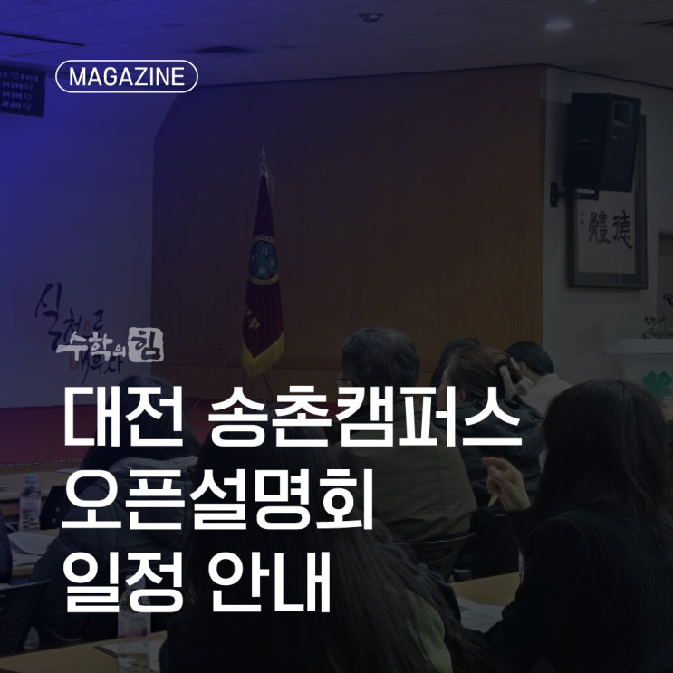 안녕하세요 여러분 초격차 수학의힘입니다. 수학의힘 대전송촌캠퍼스 오픈설명회 일정 안내 수학의힘 대전송촌캠퍼스에서 오픈설명회를 진행합니다. 이번 설명회는 2028 교육 대변화를 앞두고, 앞으로의 입시 환경과 학습 전략을 정확히 이해하고 준비할 수 있도록 돕기 위해 마련하였습니다. 특히 수학의힘의 교육 철학과 실제 프로그램 운영 방식, 그리고 명문대 진학을 위한 공부 전략까지 한 자리에서 직접 확인하실 수 있는 시간으로 준비했습니다. ✅ 1차 오픈설명회 일정 ✔️일시 2025년 12월 22일(월) 오전 11시 ✔️장소 대전 대덕구 송촌북로 36번길 36 (송촌동 스타벅스 건물 7층, 수학의힘 대전송촌캠퍼스) ✔️주제 - 2028 교육 대....... <img src="https://blogthumb.pstatic.net/MjAyNTEyMTVfNTcg/MDAxNzY1NzkxNTAxNDE4.wCpqMHT0Deopmza9qh58GVBfOISBKn8nL2vGzrTrqckg.xMf9X8l338G_wCI6OgsH6Mj7ygz5GrMrNqK3Wh6PuRkg.JPEG/1.jpg?type=s3" />