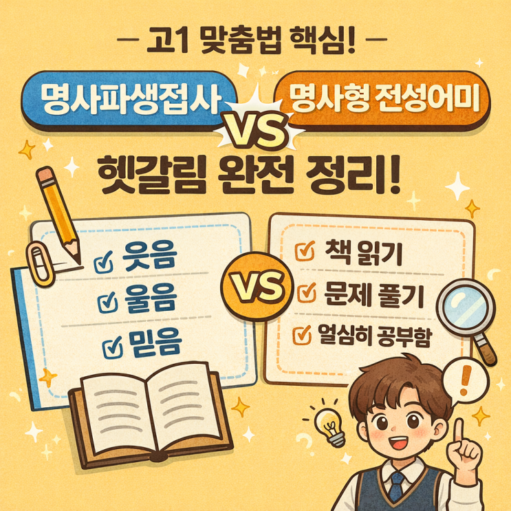 안녕하세요. 성적향상의 바이블! 수능·내신·학종의 삼위일체 학습법 국풍2000 별내관입니다. 오늘은 공통국어2 한글맞춤법 내용 중 헷갈릴 만한 거를 하나 들고 왔어요. 바로 명사 파생접사와 명사형 전성어미의 차이에 대한 겁니다. 꿈을 꿈 이런 식으로 자주 쓰진 않고 어색한 표현이긴 하지만 이 문장이야말로 둘의 차이점을 알기 가장 좋은 문장입니다. 둘이 똑같이 생겼죠? 근데 달라요. 생긴 거 비슷하다고 아예 같은 것이 되는 건 아니니까요? 당연히 공부를 열심히 했던 우리 학생들은 기본 개념이 있을 테지만 혹시 모르니까 하나 짚고 넘어가죠 둘의 차이를 알기 위해서는 우선 접사와 어미에 대한 개념이 박혀있어야 합니다. 접사 - 뜻....... <img src="https://blogthumb.pstatic.net/MjAyNTEyMTdfMjIy/MDAxNzY1OTUzMTM3NDY1.OrQbdifBx_8ILxhkzWiWrdOjMjhLTItqon0IcvfEkQMg.WL03ZiiH3j6xG15xh156AfyeNPLH02c_QQJgm4oBQrMg.PNG/ChatGPT_Image_2025%B3%E2_12%BF%F9_17%C0%CF_%BF%C0%C8%C4_03_12_44.png?type=s3" />