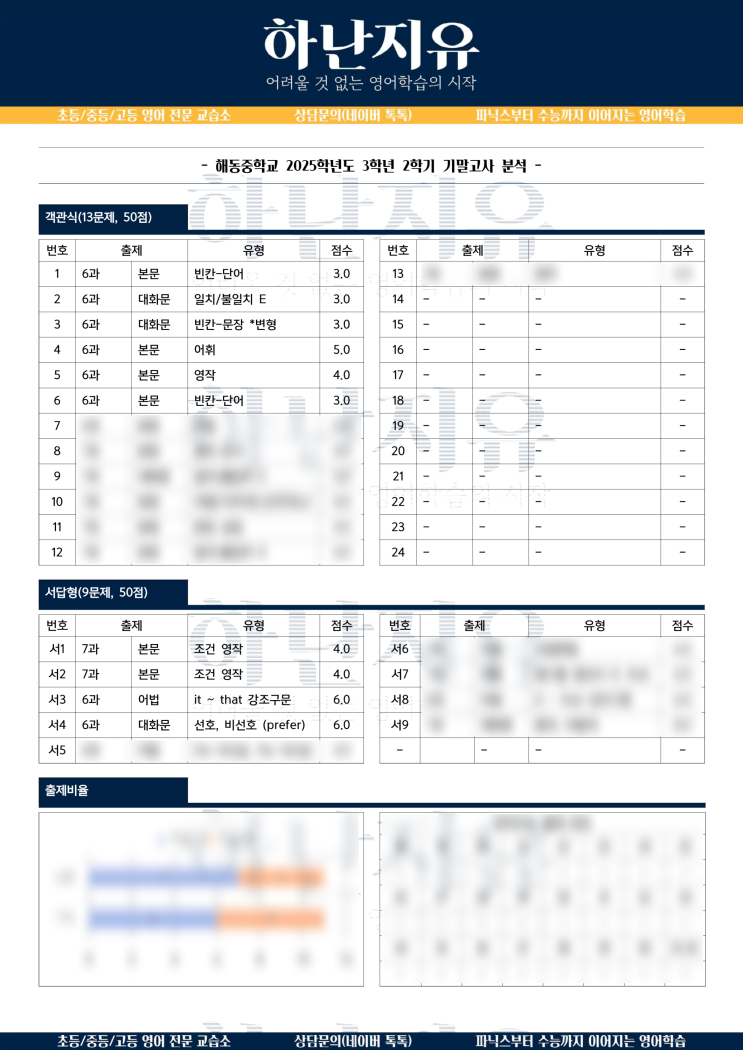 [해동중] 2025년 3학년 2학기 기말고사 분석 - 동삼동 영어 교습소, 하난지유영어