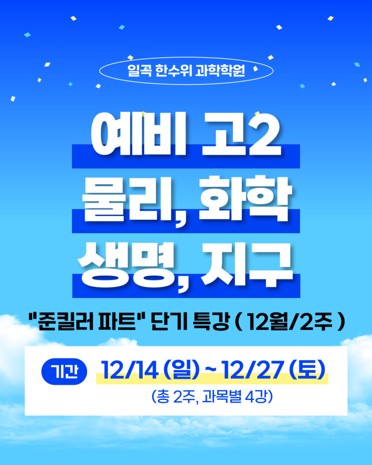 일곡동 과학학원 한수위 과학학원 제4039 호 안녕하세요. 일곡동 한수위 과학학원입니다. 예비 고2학년을 대상으로 물리 화학 생명과학 지구과학 준킬러 파트 단기특강이 진행됩니다. 과학탐구는 비킬러, 준킬러, 킬러 문제로 구분된다고 표현할 수 있습니다. 상위권 학생들은 준킬러, 킬러 문제 풀이를 할 수 있는 학생들인데요 단순 암기나 기본 개념으로는 풀 수 없는 준킬러 문항을 12월 단 2주간 특강으로 마무리할 수 있도록 준비했습니다. 짧은 시간에 실전 감각과 문제 해결 전략까지 마스터할 수 있는 이번 특강을 놓치지 마세요. 기간은 2025년 12월 14일 일요일부터 2025년 12월 27일 토요일까지 2주간 과목별 4회 수강합니다. 물리 :....... <img src="https://blogthumb.pstatic.net/MjAyNTEyMDdfNzIg/MDAxNzY1MTE2OTU3MTEz.NU1ttt_C4BUpsylSXigRSd0dJCKwW3wUwh8c6BmzwmIg.qcMKhXkYj6rdqTqeDsYqAFmaFrL-3MXQiLFDn_PHaI8g.PNG/001.png?type=s3" />