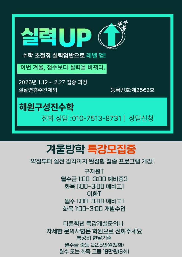 2025 겨울방학 특강안내 안녕하세요. 구성진 수학학원입니다. 이번기나긴 겨울에 뭐하고 보내시나요? 혹시 수학 한번 제대로 해보고 싶으신가요? #청라5단지수학학원 #해원중학교 #해원고등학교 #청라중고등학교 #겨울방학특강 #청라수학특강 #구성진수학학원 제대로 수학공부 해보실까요? <img src="https://blogthumb.pstatic.net/MjAyNTEyMTJfMTk2/MDAxNzY1NTI3ODM5MTI0.U3BkhWgLv0z7RkmLYJgWi2V4qTDbTNoXJZfhTy4zwMgg.XKoxbi5YFyD8Pf225JShTpldNb3mgSXptZ5gJIjXI9sg.JPEG/%C1%A6%B8%F1%C0%BB_%C0%D4%B7%C2%C7%D8%C1%D6%BC%BC%BF%E4._%281%29.jpg?type=s3" />