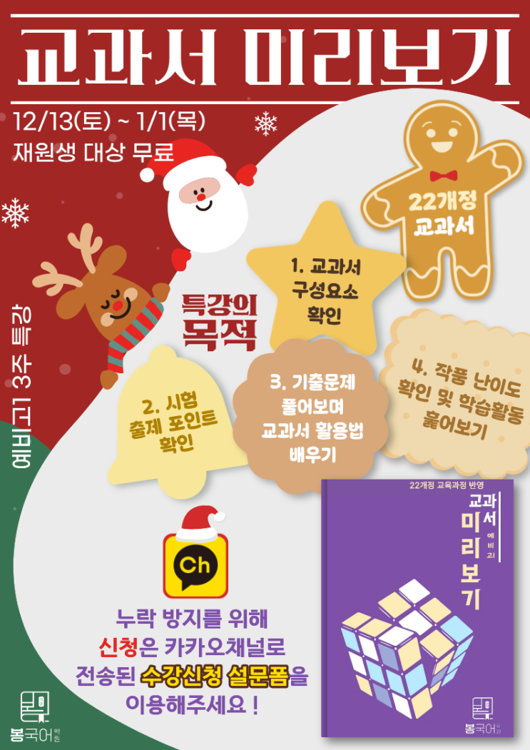 안녕하세요! 봉국어학원입니다 중학교 과정을 잘 마무리하고 고등학교를 준비하는 이 시기에, 가정에서도 여러 준비로 바쁘실 것 같습니다 :) 저희 봉국어학원에서는 지난 11월 진행했던 중3 실전 모의고사 특강이 많은 관심속에 잘 마무리 되었는데요! 그 흐름을 이어, 이번 겨울에도 예비고1 학생들을 위해 교과서 미리보기 특강을 새롭게 개강하게 되어 안내드립니다! 이번 교과서 미리보기 특강은 12월 13일부터 1월 1일까지 총 3주간 진행되며 고등학교 국어 학습을 처음 접하는 예비고1 학생들이 새 학기 시작 전에 교과서 구조와 학습 흐름을 미리 익힐 수 있도록 설계 되었습니다. 올해 특강에서는 2022 개정 교육과정 교과서를 기준....... <img src="https://blogthumb.pstatic.net/MjAyNTEyMDdfNDkg/MDAxNzY1MDg3NzIxNjY0.2FjO-FyVPOyrmvixy_9AsoTsHSQwmHATsg8B9Ne-D1wg.lOVGUnNInxRluCV5zC_uC6j5KgLY8Z-gg3aUqz7PHKwg.PNG/1.png?type=s3" />