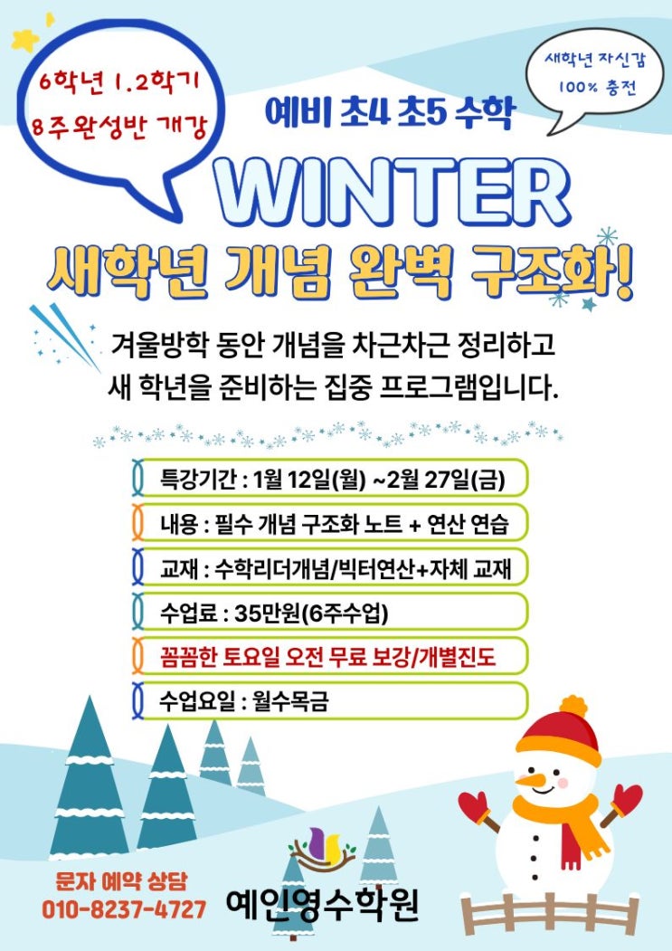 ❄️ 2026년 겨울방학 특강 모집! (예비 초4~초6) 안녕하세요, 학부모님! 새 학년 준비, 어떻게 시작해야 할지 고민이시죠? 겨울방학은 아이의 수학 실력을 한 단계 도약시킬 최적의 골든타임입니다! 저희 예인수학학원에서 초등 고학년을 위해 특별히 준비한 **<WINTER 집중 특강>**을 소개합니다. ✅ 새 학년 100% 자신감 충전 코스! <예비 초4·초5 수학 WINTER 특강> 다음 학년 필수 수학 개념을 완벽하게 구조화하고, 탄탄한 기초를 다져 아이에게 새 학년 100% 자신감을 충전해 주는 수업입니다. <예비 초6 수학 WINTER 특강> 중등 과정 진입 전, 학습 습관을 잡아줘야 할 중요한 시기에 학습량을 늘려 중등 수학 수업을....... <img src="https://blogthumb.pstatic.net/MjAyNTEyMTBfMjMx/MDAxNzY1Mjk5NjQyMTE4.KrIyjueTaoZyLxxAN7Rm7hYQrgV49ErbSthxfGd8F5Ag.4vIkaOvPHGP9mkujYvpbzZka11nRAMP3LvLjm0xqNCkg.JPEG/1765299392004.jpg?type=s3" />