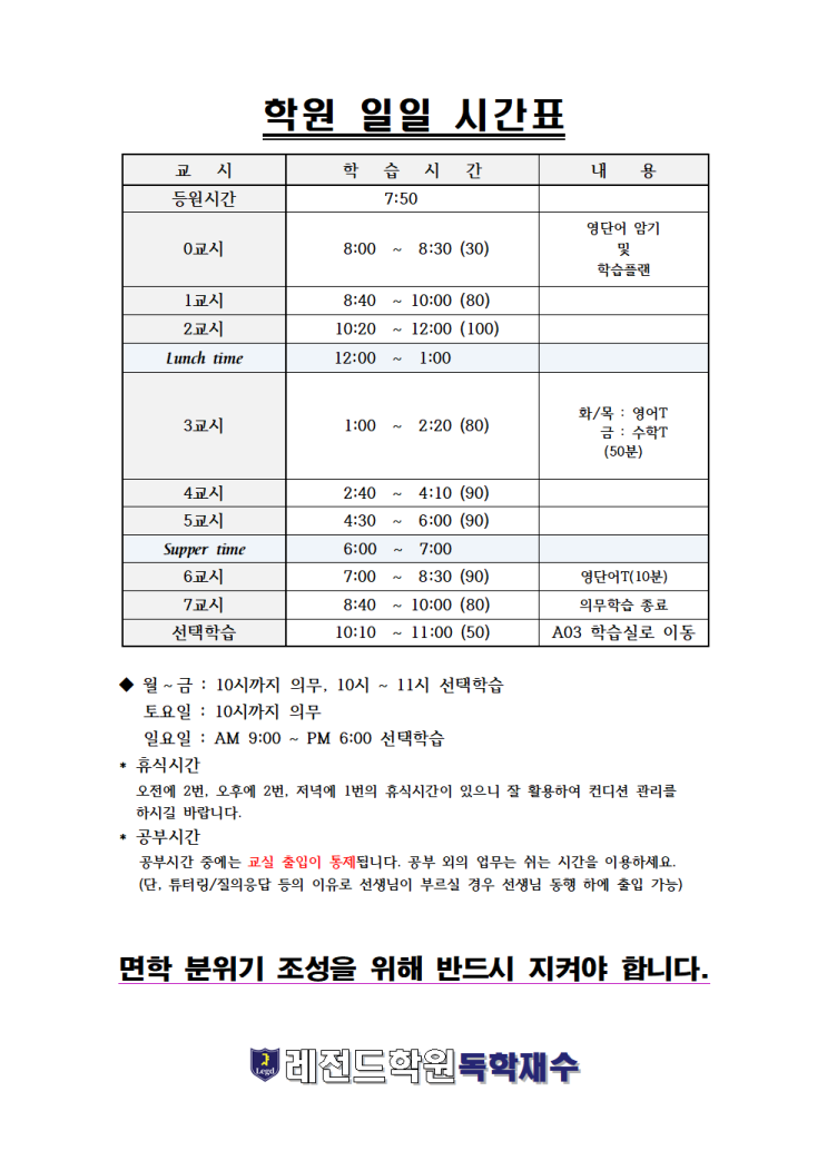 안녕하세요. 산본 독학재수 학원 레전드학원입니다. 재수, N수, Winter School 등 많은 분들과의 상담에서 시간표에 대한 문의가 많았습니다. 분명 블로그에 있을텐데... 헉... 없었습니다. 그래서 올립니다. 레전드학원 일일 시간표 등원시간 7:50 영단어 암기 0교시 8:00 ~ 8:30 (30) 및 학습플랜 1교시 8:40 ~ 10:00 (80) 2교시 10:20 ~ 12:00 (100) Lunch time 12:00 ~ 1:00 화/목 : 영어T 3교시 1:00 ~ 2:20 (80) 금 : 수학T (50분) 4교시 2:40 ~ 4:10 (90) 5교시 4:30 ~ 6:00 (90) Supper time 6:00 ~ 7:00 6교시 7:00 ~ 8:30 (90) 영단어T(10분) 7교시 8:40 ~ 10:00 (80) 의무학습 종료 선택학습 10:10 ~ 11:00 (50) ◆ 월 ~ 금 : 10시까....... <img src="https://blogthumb.pstatic.net/MjAyNTEyMTlfMjEz/MDAxNzY2MTI3Mzc0OTky.y5NcAo2WvporWURpgbhJeiQ083MKkImY2s6mY24LGW4g.YTMNG-Rjog7FpBW4Ewq5K7vkdJhPK5Hn7mdb2IBwCmAg.PNG/%BB%EA%BA%BB_%B5%B6%C7%D0%C0%E7%BC%F6_%B7%B9%C0%FC%B5%E5%C7%D0%BF%F8_%C0%CF%C0%CF_%BD%C3%B0%A3%C7%A5.png?type=s3" />