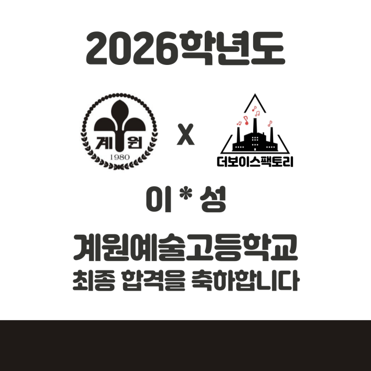 안녕하세요^^ 더보이스팩토리실용음악학원입니다 저희 학원의 이*성 학생이 계원예술고등학교에 최종 합격을 했습니다! 학원에서 늘 성실하고 열정적으로 수업에 참여하던 학생인데요! 연습도 수업도 늘 성실하고 꾸준히하던 *성이~ 이렇게 좋은 결과를 보여주게 되어서 너무 좋네요 :) 고등학교 가서도 원하는 음악 맘껏 즐기면서 행복한 학교생활 할 수 있길 바라요! 늘 응원하겠습니다~ #더보이스팩토리 #실용음악학원 #부산실용음악학원 #부산남구실용음악학원 #부산경성대실용음악학원 #부산보컬 #부산드럼 #부산베이스 #부산피아노 #부산작곡 #부산미디 #부산기타 #부산싱어송라이터 #부산실용음악입시 #부산실용음악취미 #입시학원 #예....... <img src="https://blogthumb.pstatic.net/MjAyNTExMjdfMTIx/MDAxNzY0MjQ1ODY0MDY3.SKVTCWHB58uKgh-3yvus5SrEKUPSXbrHFFu2Z-_6IMkg.Bir2FC43nXFRZd087_In-js6Jl8pV-9MZuJ-3p71Ndwg.PNG/KakaoTalk_20251127_211547748.png?type=s3" />