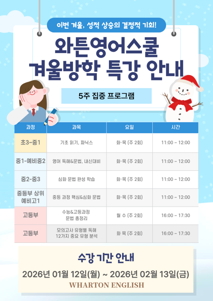 안녕하세요~ 와튼영어스쿨입니다. 한 해의 끝자락, 12월 입니다. 차분히 지난 날을 돌아보고, 새로운 시작을 준비하는 시기! 1월의 설렘과 함께 겨울방학특강 안내드립니다 :) 긴 방학 동안 소중한 시간을 헛되이 보내지 않도록, 아이들의 열정과 노력에 날개를 달아 줄 알찬 특강이 기다리고 있습니다. 2026년의 시작을 영어실력을 업그레이드 할 기회로 만들어 보세요! 겨울방학 동안 아이들의 실력을 UPGRADE할 기회를 찾고 계신가요? 1️⃣영어책이 술술! - 기초 읽기 & 파닉스 특강 기초 읽기와 파닉스 적용에 어려움을 겪고 있는 친구들에게 꼭 필요한 수업! 아이들의 수준에 맞춘 단계별 학습으로 파닉스와 문장 읽기 전반의....... <img src="https://blogthumb.pstatic.net/MjAyNTEyMTFfMjIy/MDAxNzY1NDQwODE4NjI0.yjF7xXDquzTpTJ2-2OLNSbNTT-sEyCyYtKzKoL2ccKwg.pDc378y-HP4I1N3toHFl3YA0vs85XrsQox0al1rPP04g.PNG/%C1%A6%B8%F1%C0%BB_%C0%D4%B7%C2%C7%D8%C1%D6%BC%BC%BF%E4._%2813%29.png?type=s3" />