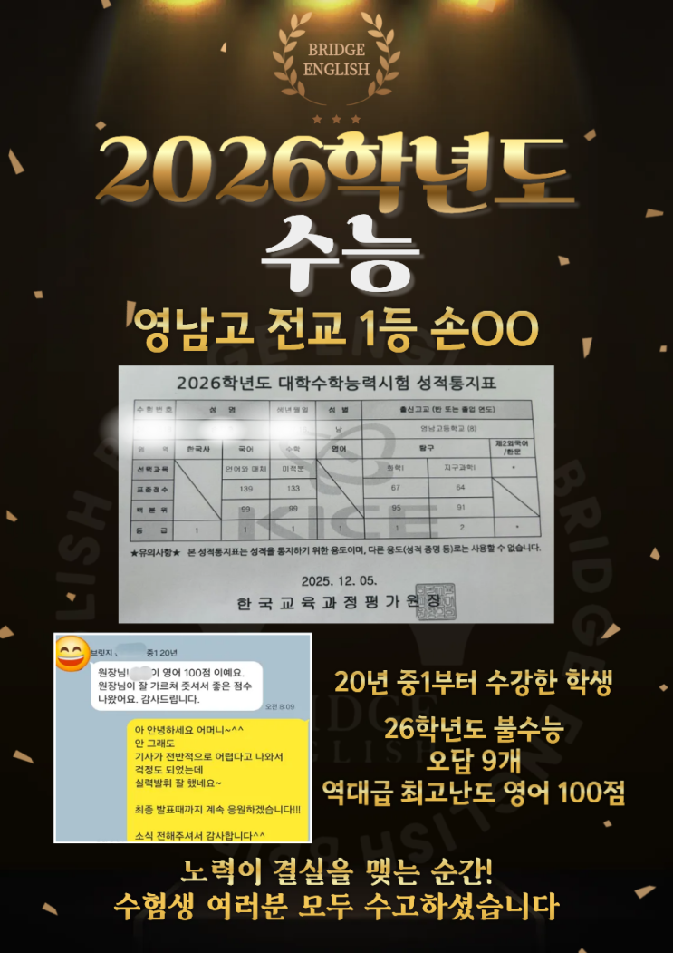 (신월성브릿지영어) 26학년도 수능 영어 영남고 전교 1등!!!