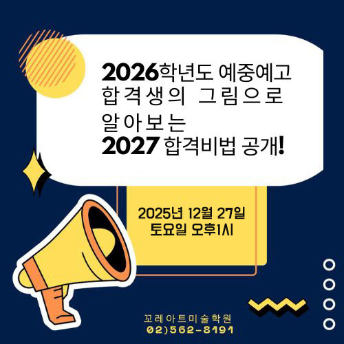 서울예고, 선화예고, 예원학교, 선화예중 2027 ' 앞으로 9개월 ' 최종 합격전략 공개 설명회 2025년 12월 27일 (토) 오후 1시 안녕하세요. 매년 예중·예고 입시에서 95점대 실기 실력으로 합격을 만들어내는 강남 꼬레 아트 미술학원 대표원장입니다. 2027학년도 예중·예고 입시가 이제 딱 9~10개월밖에 남지 않았습니다. 이 시기는 합격생과 불 합격생의 격차가 가장 빠르게 벌어지는 시점입니다. 그래서 이번에 입시설명회를 준비했습니다. 예중·예고 입시를 고민하는 학생, 그리고 그런 자녀를 둔 학부모님이라면 이번 설명회는 절대 놓치면 안 되는 자리입니다. 합격한 학생들은 마지막 9개월을 어떻게 준비했을까요? 반대로 불합....... <img src="https://blogthumb.pstatic.net/MjAyNTEyMDNfMTgg/MDAxNzY0NzYyMjU4MDYw.pBVwBPX5EMfDWne8E8k3H73iZANkhGDhVPQmqClc_LEg.7yXvPlpQeXic3GYDdFMCAtgtq56YWVGB4bGS0KvlQXsg.JPEG/2025%B3%E2_12%BF%F9%C0%D4%BD%C3%BC%B3%B8%ED%C8%B8.jpg?type=s3" />