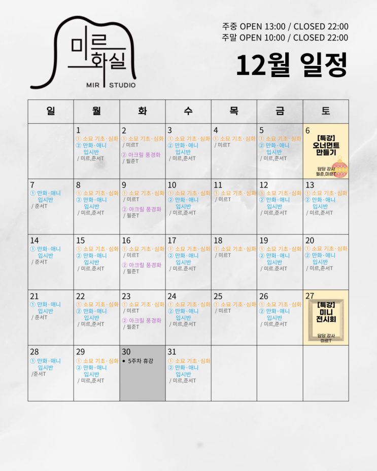 미르화실은 그림을 좋아하는 다양한 사람들을 위한 다양한 분야의 취미 전문 화실로 발전해 왔습니다. 그림의 원리와 이치를 이해하고 실력도 다지며, 취향에 맞게 힐링을 할 수 있는 공간입니다. 반복되고 지친 일상 속에 미르화실에서 예술로 통한 성취감과 행복, 조금이나마 여유를 느끼시길 바랍니다. 미르화실 미술학원 (Mir Atelier) 오창프라자1 건물 4층 (411호) 도로명: 충청북도 청주시 청원구 오창읍 중심상업로 7 지번: 충청북도 청주시 청원구 오창읍 양청리 821-4 우편번호: 28120 ph: 010-7177-7895 em: lcl__@naver.com <img src="https://blogthumb.pstatic.net/MjAyNTEyMDFfMTk5/MDAxNzY0NTY0MzY4NjIz.R21f2aES3C3w3gEnWbcQNNCWO73aFiyumYT9Wb6bIOog.TGx2A8cL969Zn_Li2gSPdW0y1cFO7__wReC77FBGB-Eg.PNG/%C1%A6%B8%F1%C0%BB-%C0%D4%B7%C2%C7%D8%C1%D6%BC%BC%BF%E4_-001_%282%29.png?type=s3" />