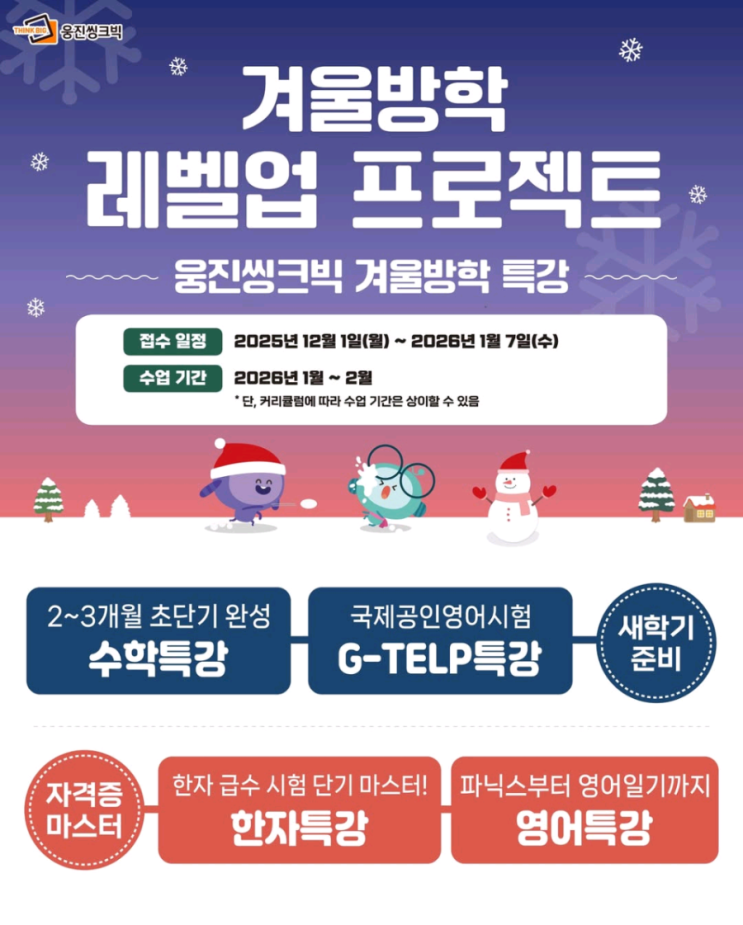 안녕하세요. 연수학원입니다. 우리 자녀들 겨울방학을 맞아 기초 학습 완성 · 새 학기 대비 · 학습 습관 정착을 목표로 겨울방학 특강 및 중등사회 , 역사.세계사반을 함께 모집합니다. ✅ 겨울방학 특강 운영 안내 운영 기간 : 12월 ~ 2월 접수 기간 : 상시 접수 (선착순 마감) ✅ 겨울방학 특강 과목 안내 수학 특강 대상 : 초등 1 ~ 6학년 내용 : 학기 핵심 개념 완성, 연산력 강화 효과 : 새 학기 수학 자신감 향상 영어 특강 / G-TELP Jr. 대상 : 초등 1 ~ 6학년, 중등 ●파닉스*영어문장만들기*영어일기쓰기 ●국제공인 영어시험 G-TELP Jr. 대비 ☆ LEVEL 1 ~ LEVEL 5 운영 한자 특강 대상 : 초등 1 ~ 6학년 한자 급수 대....... <img src="https://blogthumb.pstatic.net/MjAyNTEyMTBfMjA3/MDAxNzY1MzYzMTQ5MDI0.nxpw78NNTtjkq_ZPGLVxA0Cf5I-rKJEm8XvkD7KG5OQg.v_ZSlynOMTBTS_yq2bdi168mTPT-I18USjzkztxXb4Yg.PNG/900%A3%DF1765360238594.png?type=s3" />
