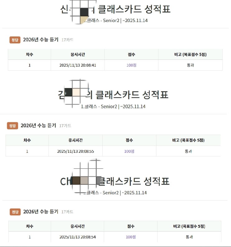Hello. I'm Kelly. 어제 "2026년 수능문제"가 공개 되자마자, 우리 시니어2반(주 구성 초6) 친구들과 함께 듣기 영역만 테스트를 진행 했습니다. 제가 애들에게 늘 말하지만, 고등 모의고사에서 듣기는 절대 틀리면 안 되는 영역입니다. 켈리 친구들은 모의고사 듣기 영역을 매주 꾸준하게 훈련 하고 있습니다. 어제 수능 문제에서 우리 시니어2(주 구성 초6) 반에서 세 명이 ‘만점’을 받았습니다. (초6 학생2명 + 중학생1 ) 물론 켈리의 중등반은 모두 만점을 받을거라 확신합니다!!!! 다른 학생들도 나쁘지 않은 점수를 받았습니다만,,,,, 블로그에는 만점을 받은 핵심 사례만 소개하려 합니다ㅎ 만점을 받은 6학년 친구....... <img src="https://blogthumb.pstatic.net/MjAyNTExMTRfMTg2/MDAxNzYzMTE4MTU3NzM2.0OotL60OBLbGtwcN4fMfZduHOtKXYI7_EwXtycHvgS4g.HzhS8FW-j788IaZZSPWKxUza_IOweVrA58BxAqGUcNEg.JPEG/KakaoTalk_20251114_194815993.jpg?type=s3" />