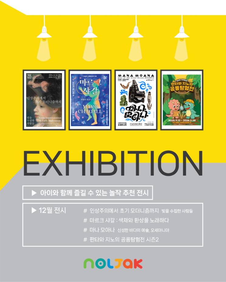 안녕하세요, 놀작 삼산아트센터입니다 12월은 아이들과 함께 예술 감성을 채우기 딱 좋은 계절이죠^-^ 오늘은 놀작이 추천하는 12월 전시를 소개해드릴게요♡ 방학 전·후로 아이들과 문화 나들이하기 좋은 전시들만 골라 담았어요! 1. 인상주의에서 초기 모더니즘까지 국립중앙박물관 특별전시실 1 25.11.14 ~ 26.03.15 ⏰ 10:00 ~ 18:00 (월요일 휴관) 19세기 인상주의에서 20세기 초 모더니즘까지의 변화 과정을 한눈에 볼 수 있는 깊이 있는 전시예요. 프랑스 회화의 흐름을 이해하고, 화가들이 새롭게 시도한 빛·색채·시선의 변화까지 관찰할 수 있어요. 아이들이 예술사의 흐름을 자연스럽게 접하기 좋아요. 2. 마....... <img src="https://blogthumb.pstatic.net/MjAyNTExMjZfMTE5/MDAxNzY0MTU4OTY1MjI5.povOrjA7QNX3qq5IhdnwfOH105xUzoiO_-KGj0snmDgg.rqFzS1JPcUCByiSPZK_KULFOPb3retY5lwDeN3Fg-0Ug.PNG/900%A3%DF0.12%BF%F9%C7%A5%C1%F6.PNG?type=s3" />