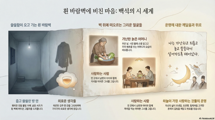 이 시는 백석의 대표시 중 하나로 화자가 좁다란 방에서 쓸쓸함과 외로움을 느끼며, 자신의 내면적 고뇌와 생각을 방의 흰 바람벽에 투영하는 과정을 보여줍니다. 이 벽 위에는 차가운 물에 손을 담그고 일하는 가난한 늙은 어머니의 모습과, 타인의 아내가 되어 행복하게 저녁 식사를 하는 사랑하는 사람의 모습이 희미한 환영처럼 스쳐 지나갑니다. 이러한 고독한 환경 속에서 화자는 자신은 세상에서 가난하고 외롭게 살도록 태어났다는 절망적인 자기 인식을 하게 됩니다. 하지만 곧 벽에는 하늘이 가장 귀애하는 존재들이야말로 가난과 외로움 속에 살도록 정해졌다는 운명적 위로의 글자가 나타나기 시작합니다. 결국 시는 개인의 고독한 삶....... <img src="https://blogthumb.pstatic.net/MjAyNTEyMDVfMjc1/MDAxNzY0OTI5MzQxNzAz.44cMaWxpJIteNoIZTWSToWUGrHfJ4OgV2xHG2mVoQ7Mg.ZX_6WD8S7N6lRdXHG0mgCFXXOV_w3ZqP8RRXIGLCC1gg.PNG/unnamed_%2810%29.png?type=s3" />