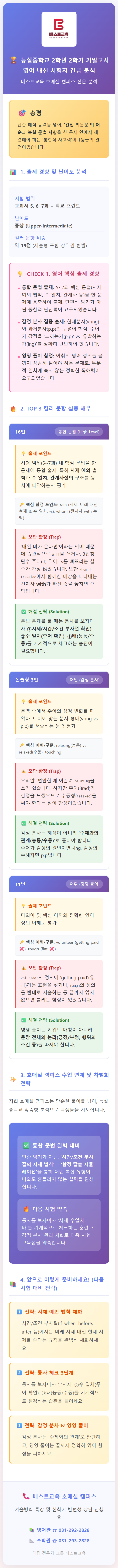 안녕하세요. 호매실영어학원 호매실수학학원 호매실국어학원 베스트교육 수원금곡캠퍼스 입니다. 현재 능실중학교 2학년 2학기 기말고사 영어 시험 분석이 마무리되어 문항 유형 분석을 해드리겠습니다. 1등급을 가른 결정적 요인, '시제 예외 법칙 & 통합 문법' 완전 분석! 능실중 2학년 영어 기말고사 시험지를 긴급 분석했습니다. (시험 범위: 교과서 5, 6, 7과 + 학교 프린트) 이번 시험은 단순 해석 능력을 넘어, 시제 예외 법칙과 수 일치, 관계사절 구조를 한 문제 안에서 동시에 해결해야 하는 '통합적 사고력'이 요구되었습니다. ✔️ 16번: If절에서 will 대신 현재 시제 + 3인칭 단수 -s 동시 체크! ✔️ 논....... <img src="https://blogthumb.pstatic.net/MjAyNTEyMTJfMTUx/MDAxNzY1NTE5OTQ4OTE4.Ox1nNRAJC-OotEWQHhzyW3Gg4tFss3DCbKh2XT69vMwg.0WXfJrIIPxcScytCMv8W0Y88RfHTe2IzjZDLbIulnyYg.PNG/%B4%C9%BD%C7%C1%DF2_2%C7%D0%B1%E2_%B1%E2%B8%BB%BF%B5%BE%EE.png?type=s3" />