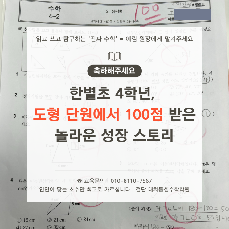 [검단신도시 수학학원] 한별초 4학년, 도형 단원 100점으로 자신감 폭발! 안녕하세요, 검단 대치동셈수학학원 김예림 원장입니다. 초4가 되면 도형·분수·나눗셈처럼 한 번 막히면 오래 가는 단원들이 슬슬 나오죠. 그래서 고학년 첫 단원부터 잘 잡아주고 싶다”는 마음으로 상담 오시는 학부모님이 많아요. 오늘은 이러한 과정 속에서도 도형 단원에서 100점을 달성한 한별초 4학년 학생의 변화와 성장 과정을 소개해 드리려고 합니다. 아이가 좋은 결과를 만드는 배경에는 분명한 학습 원리가 있습니다. 1. 개념을 눈으로 이해하는 것이 먼저였습니다 이 학생이 처음 왔을 때는 도형의 이름은 알지만, ‘왜 이게 이등변삼각형인지’, ‘각이 왜....... <img src="https://blogthumb.pstatic.net/MjAyNTExMTNfMTIx/MDAxNzYzMDI5ODIwMjQx.1XIDmiLjwios-XJD3OznNOIVey4wHV-8bumAvqsgSK8g.Q-xMf33RRNki7KZYFx-0NlXvjZ8eQ4IZUr5XSqxkTbQg.PNG/%BD%E6%B3%D7%C0%CF_%BF%B9%B8%B2-%BF%F8%C0%E5%B4%D4_-005_%282%29.png?type=s3" />