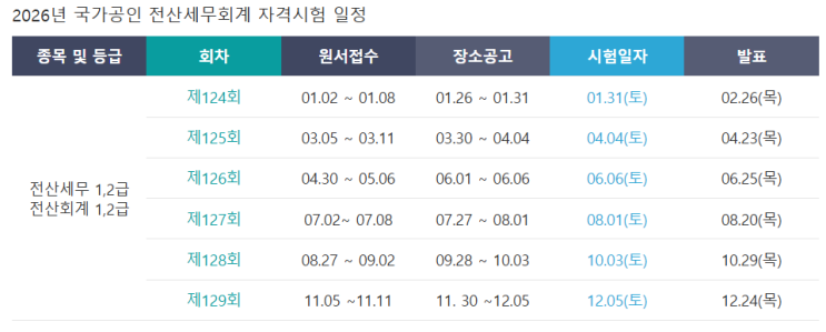 안녕하세요 ^^ 올해도 마지막 달이네요. ㅎ 열심히 강의하다고니 1년이 훌쩍 지나갔습니다. 올 한해 마무리 잘 하시고 내년을 위해 또 화이팅 하세요. 2026년도 전산회계 시험 일정을 공유해 드립니다. 내년에는 2월에 설 연휴로인해 1/31일에 시험이 있으니 참고하세요. 더클컴퓨터학원에서는 전국 합격률보다 높은 합격률을 보여주고 있습니다. 이유가 뭘까요? ㅎ 제가 잘 가르치.... 는 것도 있지만 ㅎ 개별진도로 가르치다보니 놓치지 않고 배울 수 있으며 이해가 안되는 부면은 반복해서 가르쳐 드리다보니 합격률이 높아 집니다. 많은 문의 해주세요 ^^ 그럼 오늘도 이달도 행복하세요~~ (독감도 조심하세요) <img src="https://blogthumb.pstatic.net/MjAyNTEyMTJfMjk4/MDAxNzY1NTAzMTY4NjMx.rhIhIU7NgpaoHB-NUVkIt1FxRjw4r472jds3rNnyBtog.4yLuba5meUJGpywtf8EWsrTNLJoNvdv_APtWMGT5XIAg.PNG/image.png?type=s3" />