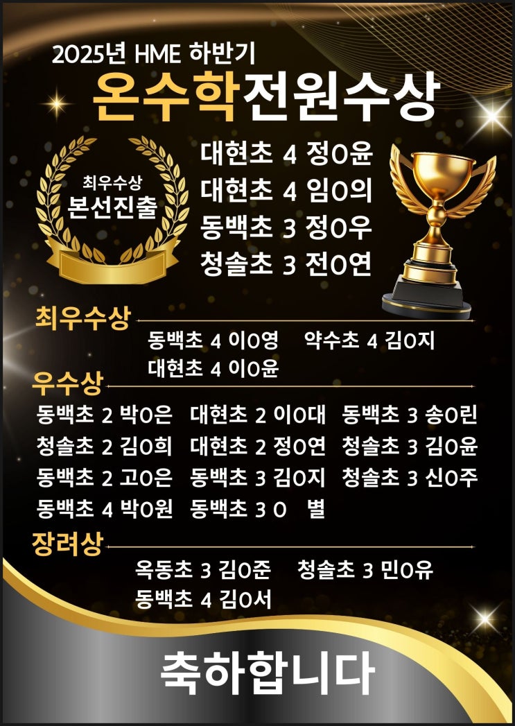 안녕하세요! 수학이 만만해지다! 온수학원장입니다. 2025년 하반기 HME 해법수학 학력평가에서 값진 성과를 낸 온수학 학생들의 수상 소식을 전해드립니다. 이번 HME는 전국 단위로 치러지는 큰 규모의 평가로, 실력 점검은 물론 상위권 학생들에게는 실력 인증의 기회가 되는 중요한 시험이죠. 우리 온수학 학생들은 매주 주말마다 빠지지 않고 연습했고, 평일에도 실전과 비슷한 환경에서 꾸준히 도전하며 생각하는 힘과 끈기를 단단히 키워왔어요. 쉽지 않은 과정이었지만, 지치고 어려운 순간마다 한 번 더 해보려는 마음이 참 대견했습니다 ‘매일 성실한 학습’과 ‘작은 변화의 누적’이 바로 이런 결과를 만들었습니다. 수상이라는 멋진....... <img src="https://blogthumb.pstatic.net/MjAyNTEyMDlfMSAg/MDAxNzY1Mjc5ODQ4NDI5.Ea5gfUcHlG8mzWupXsVkj6F4ABRZSeN1tjVA37EAGXIg.FPWNyhX8PebiIdkEgiAR6DOIuuNJ8QrpV1j0XuO3KLIg.JPEG/2025%B3%E2_hme_%C7%CF%B9%DD%B1%E2_%283%29.jpg?type=s3" />