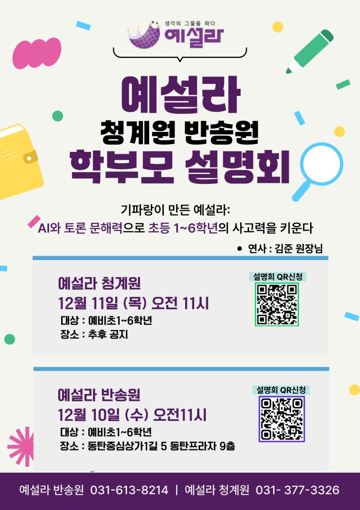 안녕하세요! 기파랑문해원에서 새롭게 선보이는 예설라 반송원, 청계원 설명회를 소개해드립니다. 일정 및 장소 예설라 반송원 학부모 설명회 12월 10일(수) 오전 11시 대상: 예비초1 ~ 예비초6학년 장소: 동탄중심상가1길5 동탄프라자 9층 상담번호 : 031-613-8214 설명회 신청 https://naver.me/x2cqzpDi 예설라 청계원 학부모 설명회 12월 11일(목) 오전 11시 대상: 예비초1 ~ 예비초6학년 장소: 추후 공지 상담번호 : 031-377-3326 설명회 신청 https://naver.me/FlcsGCO0 기파랑문해원이 개발한 문해력 전문 브랜드 ‘예설라’는 초등 1학년부터 시작할 수 있는 체계적 문해력 교육 프로그램으로, AI 시대를 맞이한 아이들의....... <img src="https://blogthumb.pstatic.net/MjAyNTExMjJfMzEg/MDAxNzYzNzkyMTY0MDI2.KUYdzTpUY-rcBKp3p-2dKo5AWgd3XAlI-pi4cHW6p1Mg.g1V7Fpfj4YLrXM-oo9Obo1AzdBJQ5Ib5KhfttoceITIg.JPEG/%C1%A6%B8%F1%C0%BB-%C0%D4%B7%C2%C7%D8%C1%D6%BC%BC%BF%E4_-001_-_2025-11-22T131325.315.jpg?type=s3" />