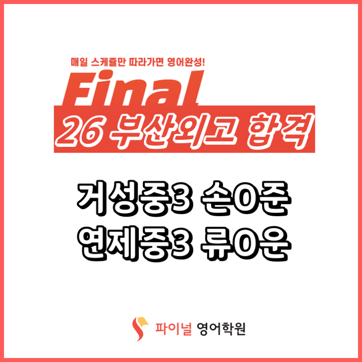 안녕하세요~!!! 26학년도에도 파이널 영어학원에서 합격 성취를 이뤄내게 되었습니다! 검증된 체계적인 커리큘럼 으로 매년 부산외고, 김천고, 포철고, 국제고 준비 뿐만 아니라 원하는 목표대학까지 합격할 수 있도록 대비 하시길 바랍니다! 궁금하신 부분이 있으시면, 장소는 아래의 지도와 같으니 학원에 방문 하시거나 하단의 전화번호로 편안하게 문의 부탁드립니다 :) <img src="https://blogthumb.pstatic.net/MjAyNjA0MTBfNzIg/MDAxNzc1ODEwMTQ1MzY5.Zt_mBdFv5uOZqma4GJY2XSOlEC9_CMU_KE_pyjOvDOgg.AJsNYucrHWQbQ4HVm-4GFPZIvfK58-iQAx7fKwRguCAg.PNG/%BA%CE%BB%EA%BF%DC%B0%ED_%C1%A6%C0%DB.png?type=s3" />