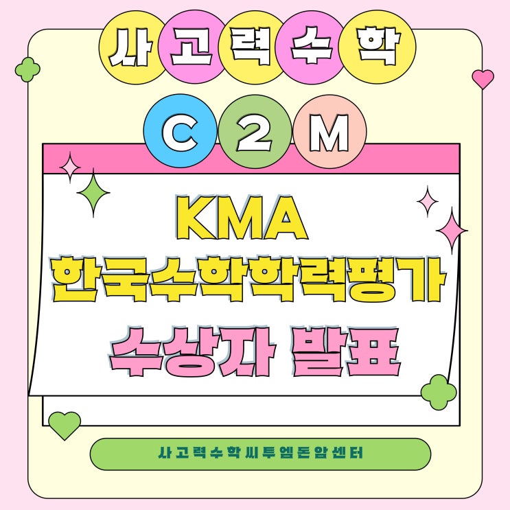 안녕하세요! 사고력 수학과 교과 수학을 동시에 배울 수 있는 곳, 사고력이 쑥쑥!! 창의력이 쑥쑥!!! 자라는 수학 사고력수학씨투엠 돈암센터입니다. 오늘은 아주 따끈따끈하고 기분 좋~~~은 소식을 가져왔답니다!! 무슨 소식일까요?? 지난 11월 15일 토요일에 KMA 한국수학학력평가 시험이 있었던거 다들 알고 계시죠? KMA 시험을 위해서 우리 씨투엠 돈암센터에서는 KMA 대비 특강도 했었는데요 그 덕분일까요??? 우리 씨투엠 아이들 정말정말 대단한 결과를 가지고 왔지뭐에요 정말 뭐랄까.... 감동 그 잡채였달까요??? 너무너무 고생많았어 애들아~~~~~~~~~~~ 학원으로 온 상장과 메달을 우리 아이들에게 전달하기 전!!! 이건 자랑을 안할수....... <img src="https://blogthumb.pstatic.net/MjAyNTEyMTdfMTE0/MDAxNzY1OTYyNTI3NDE1.ajrCUpopYKVYEczkAi0eWFHYY6S809850RRemVd9V8Eg.I9WedlXhCiYxA-6xUA8S6tBWhf6rKvmfOr5Aq1LVr3sg.JPEG/%C1%A6%B8%F1%C0%BB-%C0%D4%B7%C2%C7%D8%C1%D6%BC%BC%BF%E4_-001.jpg?type=s3" />
