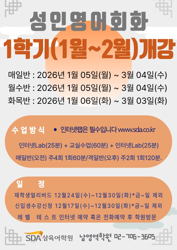 [남영] 성인영어회화 26년 1학기(1월~2월) 개강 안내