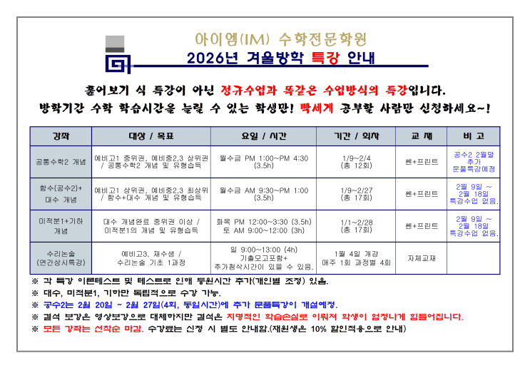 아무나 할 수 없는 수업, 아이엠수학 입니다. 해본 학생들만 안다는 공포의 겨울방학 특강! 아이엠수학 방학특강이 목동 내 모든 학원 중 가장 빡센 특강이라는 거.. 잘 아시지요? 방특 시작하면 전쟁 시작이에요! 결석 절대 불허! 주초에 겨울방학 특강 개강 안내를 올렸어야 했는데, 최종 시간 일정 조율을 하다보니 많이 늦어졌습니다! 재원생 이외의 학생들은 우선 대기 신청이 가능하고, 재원생이 신청이 종료된 후에 선착순으로 등록안내를 드리고 있습니다! 재원생 신청기간은 다음주 금요일(19일)까지 입니다! 수리논술 세부 커리큘럼은 내일 업로드 예정입니다! <img src="https://blogthumb.pstatic.net/MjAyNTEyMTNfMTMz/MDAxNzY1NTUyMjkzODc0.GQG4Oyj8e0TQpPorwBdzN739ynS5X5gTQm86eoi1RAsg.uk7CllVuH6uYRpnl3Fh9em9xEvN1MaDO_--HGAaStCIg.PNG/%BE%C6%C0%CC%BF%A5%BC%F6%C7%D0-2026%B3%E2_%B0%DC%BF%EF%C6%AF%B0%AD%B0%E8%C8%B9.png?type=s3" />