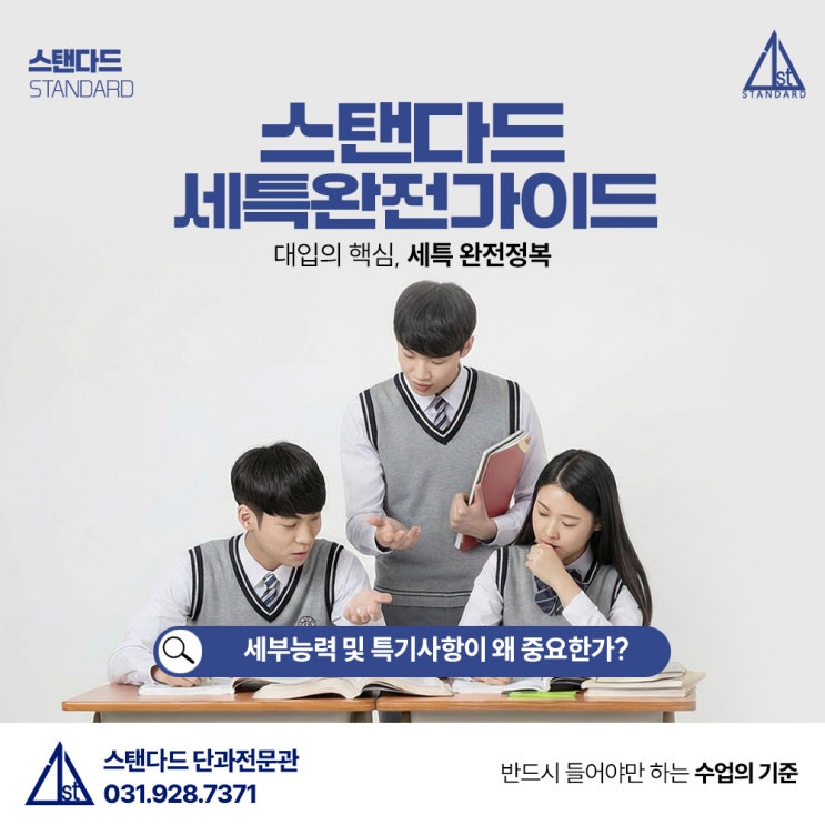 의정부수학학원 민락동수학학원 송양고수학학원 스탠다드에서 정리한 세부능력 및 특기사항의 모든 것 현재 대입 체제에서 세특은 수능·내신 다음으로 가장 강력한 평가 요소입니다. 특히 학생부 기재 항목이 축소된 2025학년도 이후에는 학생의 학업과정·태도·성장을 확인할 수 있는 거의 유일한 정성 자료로 남았습니다. 오늘은 스탠다드학원이 교육부 지침, 대교협 평가요소, 입학사정관 인터뷰, 주요 기사 내용을 기반으로 학부모님이 반드시 알고 계셔야 할 세특의 본질과 전략을 정리해드립니다. 1. 세특(세부능력 및 특기사항) 이란 무엇인가? 세특은 학교생활기록부 내 교과학습발달상황의 서술형 기록으로, 각 과목 담당 교사가 수업·평....... <img src="https://blogthumb.pstatic.net/MjAyNTEyMTFfNTYg/MDAxNzY1NDQ1NDQ4MDc0.4BVP2EMkcWaencZrNC6dPkdw45g-YuK58mvLL_AnaDsg.GQIrbz86k2gRIdP5hA0olg44ixL1DoVxTRTXwfgIQYkg.JPEG/%C0%C7%C1%A4%BA%CE%BD%BA%C5%C4%B4%D9%B5%E5.jpg?type=s3" />