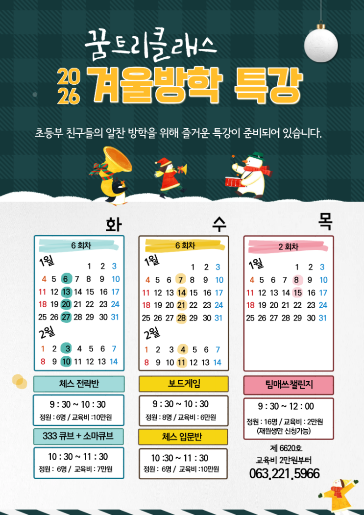 안녕하세요. 여름방학은 항상 너무 짧은데, 겨울방학은 또 너~~~~무 길지요. 두 달이라는 시간을 어떻게 채우고, 어떻게 보내야 할지 고민이 많으실 거에요. 겨울방학 두 달의 시간을 어떻게 보냈는지에 따라, 새 학기를 맞이했을 때 아이들의 역량이 달라져 있음이 아이들의 모습에서 분명하게 드러납니다. 그래서 초등 저학년의 겨울방학은 좀 달라야 합니다. 단순한 학습 보충을 넘어, 아이들의 평생 취미가 될 만한 활동, 푹 빠져서 해볼 만한 특기를 만들어 주는 시간이 충분히 확보되었으면 좋겠습니다. 학기 중에는 시간이 부족해 못 해봤던 것들, 재미있는데 혼자 하기엔 좀 어려움이 있었던 것들로 구성한 꿈트리 겨울방학 특강! 재미와....... <img src="https://blogthumb.pstatic.net/MjAyNTEyMTNfMTA2/MDAxNzY1NTk3MzI3NTM1.bUN9ZKAuvfr4WmL0PGbq0dz1vElJcrAfz6INVUP7tcUg.Rvkx9-Czs0pUclXWh_gr5vHEFeXHGYAoN_xcC3ocFCkg.PNG/2.png?type=s3" />