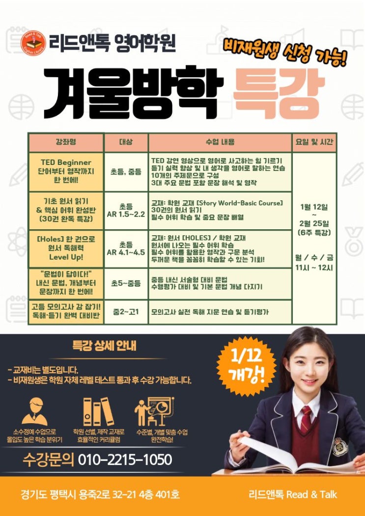 안녕하세요, 리드앤톡입니다! 다가오는 겨울방학, 리드앤톡에서 준비한 집중 영어 특강 프로그램으로 영어 실력을 확실하게 끌어올려보세요! 집중 6주! 영어 실력 한 단계 업그레이드의 기회✨ 소수정예 수업으로 진행되어 개인별 피드백이 세밀하게 이루어지고, 몰입도 높은 학습 환경 속에서 단기간에 실력 향상을 경험할 수 있습니다. 특강 프로그램 안내 1️⃣ TED Beginner – 단어부터 영작까지 한 번에! 재미있는 TED 영상을 활용해 듣기·읽기·쓰기 능력을 통합적으로 키우는 과정입니다. 2️⃣ 기초 원서 읽기 & 핵심 어휘 영작반 (30권 완독 특강) 다양한 원서를 통해 독해력 향상은 물론, 핵심 어휘와 문장 쓰기 실력까지 함....... <img src="https://blogthumb.pstatic.net/MjAyNTExMDZfMjUw/MDAxNzYyNDE3ODc3NzEx.kxHmBOjgmk8T5LHamCRDPI1Jn0GTyFF39oW71nzWRkcg.Q-Z4n_H2FX9uYJRgM5jIzoMmaYSw_h9K7Nulbah999wg.JPEG/25_%B0%DC%BF%EF%B9%E6%C7%D0_%C6%AF%B0%AD_%C0%FC%B4%DC%C1%F6.jpg?type=s3" />