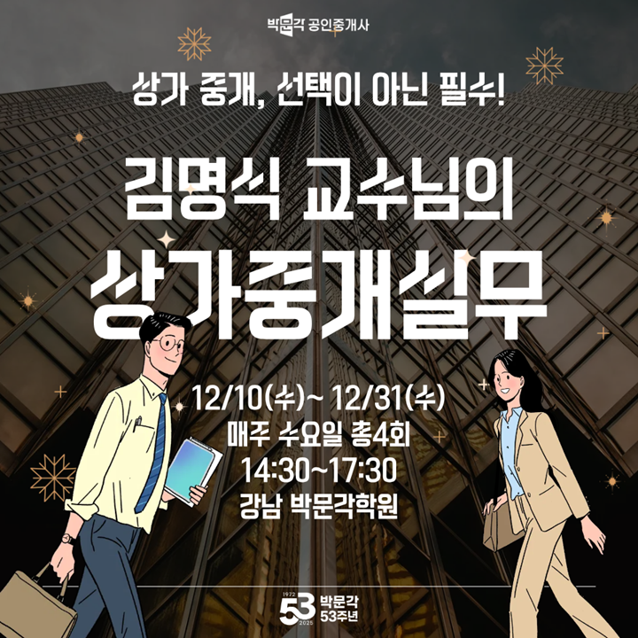 안녕하세요. 추운 겨울을 녹이는 도전하는 여러분의 열정과 함께합니다. 공인중개사 합격의 기쁨으로 가득한 12월 이 기쁨을 실제 창업 등 새로운 도전의 원동력으로 바꿔 나가야 할 때입니다. 공인중개사를 합격한 뒤 중개사무소를 개업하거나 소속 공인중개사로 일을 하시거나 또는 법인의 사원 또는 임원 전원 또는 분사무소의 책임자의 경우 개업 또는 고용신고일 전 1년 이내 한국공인중개사협회의 공인중개사 실무교육을 의무적으로 받으셔합니다. 중개실무, 등기실무, 전자계약시스템, 세법 관련 등 실무에 도움이 되는 다양한 내용을 배우게 되지만 중개사업의 세부적인 각 영역에 대한 보다 전문적이고 실제적인 내용이 배우고 싶으신 분....... <img src="https://blogthumb.pstatic.net/MjAyNTEyMTJfNzEg/MDAxNzY1NTIyMjk1OTcy.Hs5o4De-V7AWPIqcR2jsytXjiidWdErqvIrK2BUtDDMg.t5WQMsJL6_Z9SAC_LosnTCQTtj0ZKfjpg93BLV2le-cg.PNG/565.png?type=s3" />