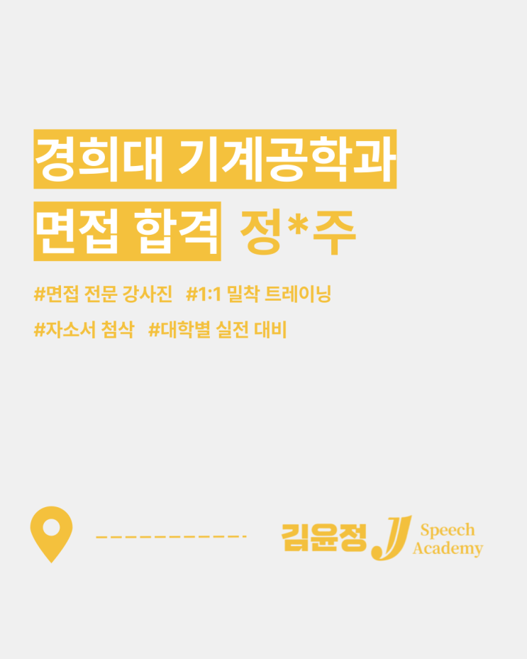 경희대학교 기계공학과 합격을 축하합니다 :D 경희대 기계공학과 면접을 준비한 학생은 자심감이 느껴지는 비언어적 표현과 논리 정리가 필요했습니다. 내용은 충분했지만 설명 과정에서 흐름이 끊기는 부분이 있어, 개념 정리와 구조화 연습을 중심으로 진행했습니다. 또한 모의면접을 반복하면서 표정부터 자세, 눈빛까지 비언어적 표현을 교정함과 동시에 구조화 훈련을 통해 짧은 시간 안에 핵심을 말하는 힘이 생겼고, 실제 면접에서도 큰 어려움 없이 잘 마무리했다고 합니다. 결과는 경희대학교 기계공학과 합격. 합격을 진심으로 축하하며, 앞으로의 대학 생활을 제이스피치아카데미가 응원합니다. <img src="https://blogthumb.pstatic.net/MjAyNTEyMTJfMjQw/MDAxNzY1NTI3MjQxMDY3.1bJF5jil2dfdYr5FrqfMJkGy0V-OgCPvHR8WEGY1jQAg.CUZwylYJnNiSGE353qjK2YAmIbzQKlWpKHntFw7Ucowg.PNG/003.png?type=s3" />