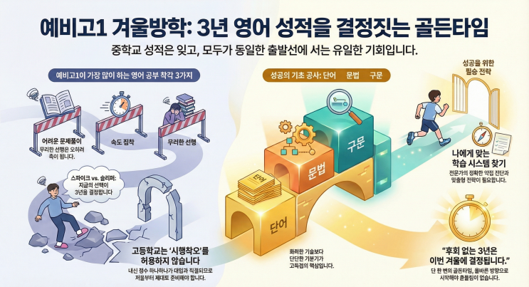 고등학교 입학 전, ‘스파이크’와 ‘슬리퍼’ 중 무엇을 선택하시겠습니까? 고등학교 입학을 앞둔 예비고1 학생, 그리고 학부모님. 곧 다가올 겨울방학이 앞으로 3년의 성적을 결정짓는 시기라는 사실, 알고 계실까요? 중학교와 고등학교의 공부는 양도, 난이도도, 결과의 영향력도 완전히 다릅니다. 저는 이 시기를 늘 이렇게 비유합니다. “100m 출발선 앞에서, 지금 스파이크를 신을지 슬리퍼를 신을지 결정하는 순간.” 슬리퍼를 신고 출발한 학생이 스파이크를 신은 친구를 따라잡기는 정말 어렵습니다. 이번 겨울방학은 단순한 ‘선행’의 시기가 아니라, 앞으로의 3년을 버틸 공부 체력과 전략을 완성하는 골든타임입니다. 이 글에서는 왜....... <img src="https://blogthumb.pstatic.net/MjAyNTEyMDJfMTk0/MDAxNzY0NjExMTE1NTk1.Vf9LjflNw5sXK8QNSX3P-lQmRbNKfnTetc5bNDD2avsg.ApexuCwGP38v8gMaoy3iAMYUmGGVZ5BKKfb-k1GA3tMg.PNG/%BF%B9%BA%F1%B0%ED1%BA%ED%B7%CE%B1%D7.png?type=s3" />