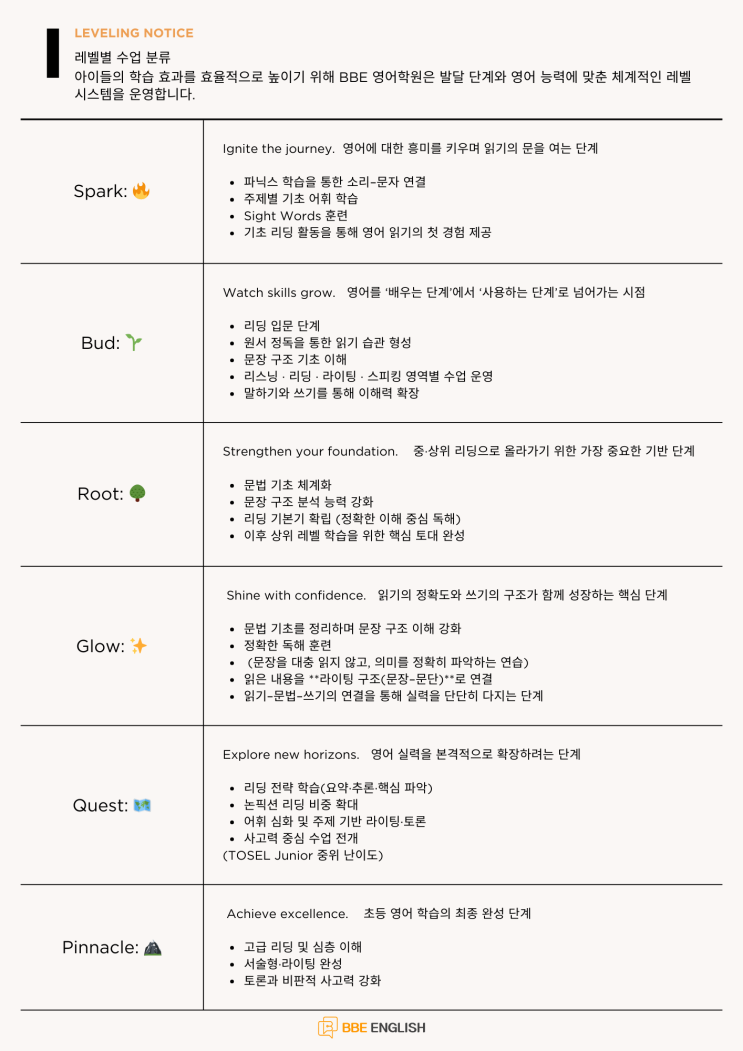 초등 영어의 시작, 이렇게 다릅니다 BBE 영어학원 신입생 입학설명회 안내 안녕하세요, BBE 영어학원입니다. 그동안 정말 많은 학부모님들께서 “입학설명회는 언제 하나요?” “2026학년 신규반 설명회 일정은 언제 나올까요?” 하고 꾸준히 연락을 주셨는데, 이제서야 이렇게 안내를 드리게 되었습니다. 기다려 주신 학부모님들께 먼저 감사의 말씀을 전합니다. BBE에서는 아이의 영어를 한 번 시작하면 오래, 그리고 올바르게 가져가야 한다고 생각합니다. 그래서 설명회 역시 단순한 학원 소개가 아니라, 아이의 현재 영어 단계는 어디쯤인지 어떤 순서로 영어 실력이 자라나는지 왜 레벨링이 중요한지 BBE는 어떤 기준으로 수업을 설계하는....... <img src="https://blogthumb.pstatic.net/MjAyNTEyMTdfMjMg/MDAxNzY1OTA3NDU1NTQ2.uULh210MrlqiCS7C7DYoXMkHRX8c84G_ytA1SVpfFmUg.bttRR_K75alb7KS8yhrH1P2V88VbPzlvvXieR6D8kjMg.PNG/new_semester_leveling_notice2.png?type=s3" />
