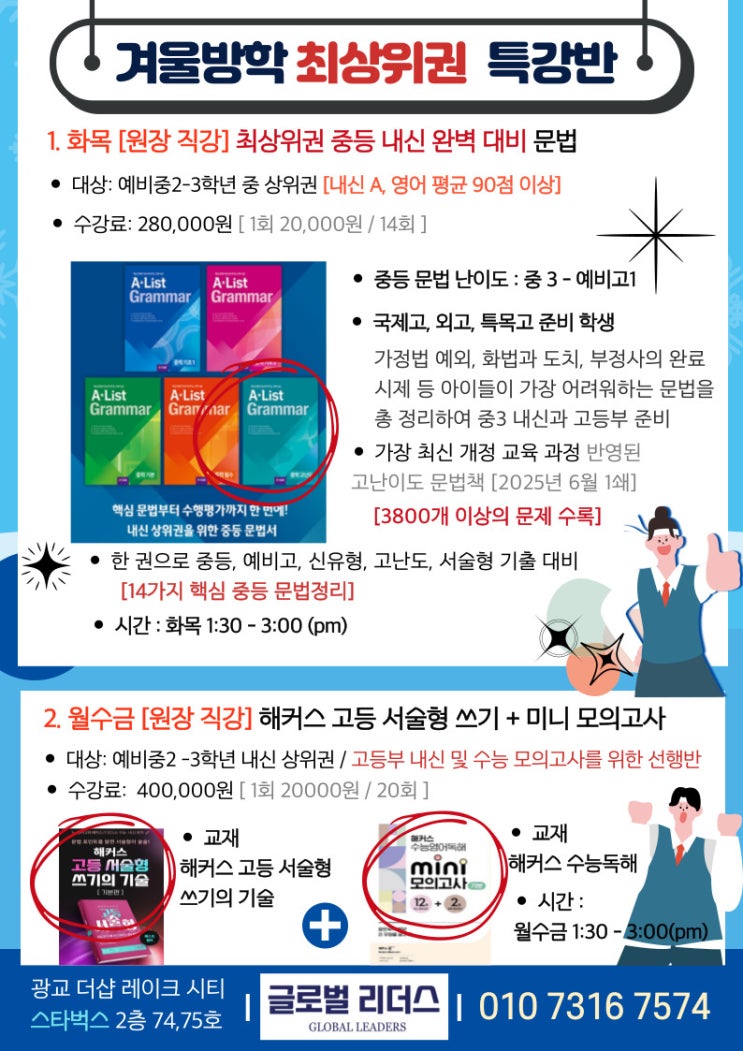 안녕하세요! 광교 글로벌리더스 영어 수학 학원입니다! 겨울방학 특강 신청 기간 입니다 ^^ 상담이 필요하신 분은 연락주세요~ 예비 중2-3학년 최상위권 내신 등급 A 친구들 스파르타 매일반 수업 글로벌리더스 영어수학원 방학 특강이 많.관.부탁드립니다~~ 초등 원어민 특강 매일반 중등 예비중 특강 문법 및 해리포터 원서반 초등부 특강은 만원의 행복 한학기 선행학습을 통해 경쟁을 넘어 단단한 뿌리를 다질 이번 겨울 방학 수학 방학트강 신청 원장 성과 책임 수업! <img src="https://blogthumb.pstatic.net/MjAyNTExMjZfMTMz/MDAxNzY0MDk4ODQyMDMx.MShaPeVOB1BBxCHjOzePTJzw3nMz7XrU8yG_KED2VDkg.LUTfxzw6B5-sRvR1yc685-3SwKmh1utw77unFsVF2QYg.JPEG/001.jpg?type=s3" />