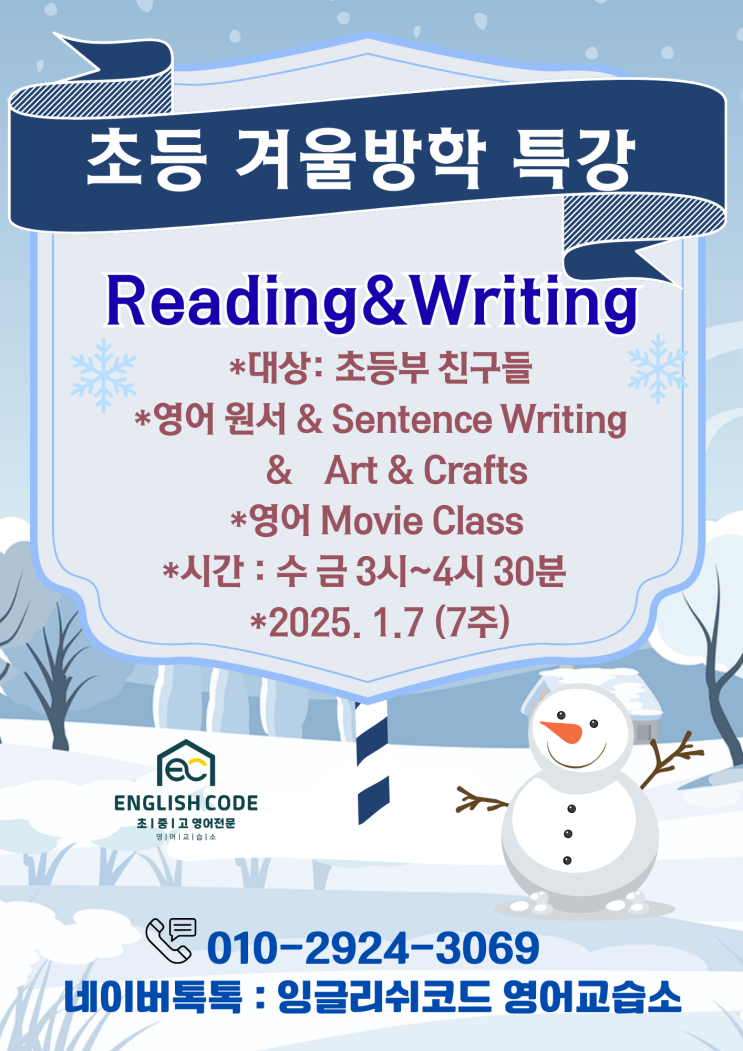 이제 추운 겨울이 시작되려는지 으스스하고 추운 바람에 따뜻한 라떼 한잔을 꼭 쥐고 출근하고는 하는데요. 이런 겨울이 되면 생각나는 것! 바로 잉글리쉬코드의 겨울 방학 특강이예요. 망포동 잉글리쉬코드에서는 매년 겨울방학 특강으로 원서 특강과 문법 특강을 하면서 우리 친구들과 겨울 방학을 따뜻하게 보내고는 합니다. 초등 중등 각 레벨에 맞게 우리 친구들이 영어를 재미있게 그리고 빠르게 습득하고 배울 수 있는 기회를 제공하여 학기 중에는 집중 하기 어려운 원서 읽기 시간을 가지고 새 학기에 대비한 문법 특강을 준비했습니다. 소수정예 맞춤 수업으로 영어에 자신 없던 친구들의 영어력을 향상 시킬 수 있고 어렵기만 하던 영....... <img src="https://blogthumb.pstatic.net/MjAyNTExMzBfNDAg/MDAxNzY0NTAwMjExODQ0.ZA-YWWOvdd_Dnqe2Qb7ET7vvbr55PZgvYLunyBBqVDcg.WEzs8txC26ob3o8_Fu_VM5kcFServgI7szhTn0idhXog.PNG/%C7%CF%B4%C3%BB%F6_%B9%E8%B0%E6_%B4%AB%BF%C0%B4%C2_%BE%F0%B4%F6_%C7%B3%B0%E6_%BF%B5%BE%EE%C7%D0%BF%F8_%B0%DC%BF%EF%B9%E6%C7%D0_%C6%AF%B0%AD_%C0%FC%B4%DC%C1%F6_%284%29.png?type=s3" />
