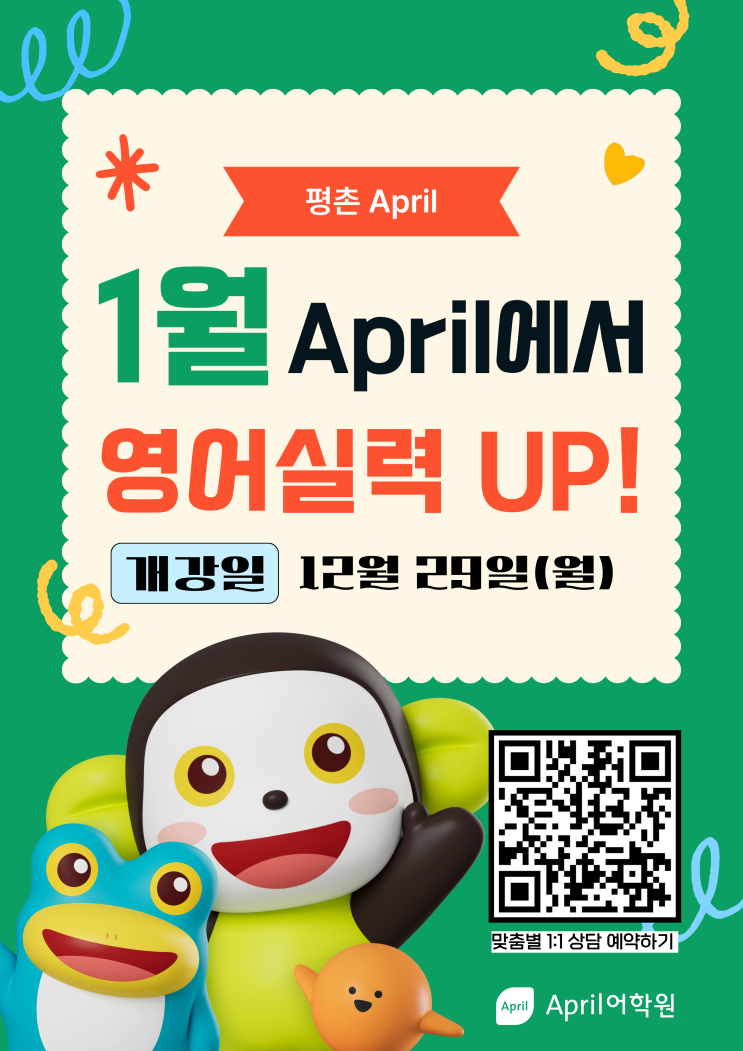 ▍26년 1월 개강일 안내 (겨울학기) 월ㆍ수ㆍ금반 ▶️ 12월 29일(월) 개강 화ㆍ목반 ▶️ 12월 30일(화) 개강 *1월 상시 입학 가능합니다. ▍겨울방학특강 기간 ✅26년 1월 12일(월) ~ 2월 6일(금) 주 5일 / 4주 / 총 20회 ✅신규생, 재원생 전 레벨 대상 *신규생은 입학시험을 통해 맞춤별 특강 클래스로 배정됩니다. 26년 겨울방학 특강 알아보기 ▍파닉스 기초반 입학 안내 ☑️ 파닉스 3개월 집중 과정(12월~2월) ☑️ 영어 기초부터 탄탄하게 시작하고 싶은 예비 7세~초등 저학년 대상 * 1월 Book2 시작일: 12월 22일(월) Phonics Starter 알아보기 ▍2026년 봄학기 안내 April어학원의 최상위 엘리트 클래스, 2026년 봄....... <img src="https://blogthumb.pstatic.net/MjAyNTEyMDJfMTM4/MDAxNzY0NjgxMjgzMjQ2.XpSZzSdGByYtZpBvl42wmd3wx3BfHzOWAbdukNqG5ccg.D7jSRuf4IFn6_e9ZAtPI_Ap9RCQioXbxbHjs8_OeTUMg.PNG/%B0%B3%B0%AD_%BE%C8%B3%BB%B9%AE_A4.png?type=s3" />