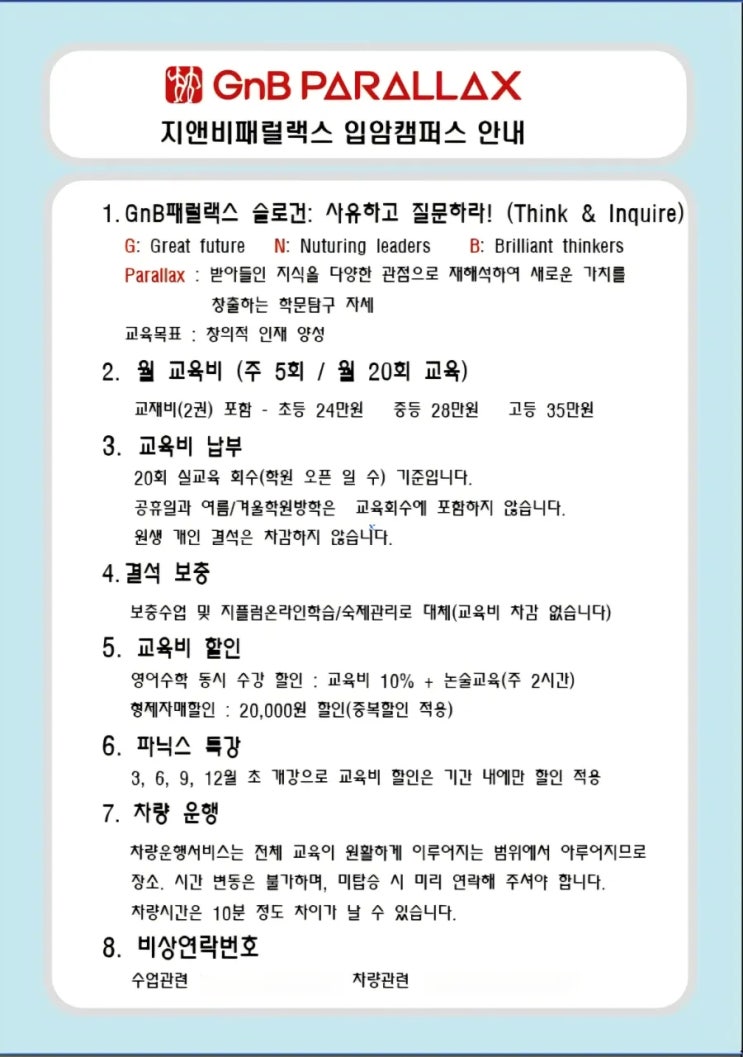 엄마들이 잘 못 알고 있는 수학 학습법 냉정하게 사실만 말해드립니다. 초등입학설명회는 사전예약이 필수입니다! 📍 초등입학설명회 12월 매주 화, 토 화 : 오전 10시 / 토 : 오후 3시 대상 : 초 4,5,6학년 학부모 사전예약 : 02-416-3355