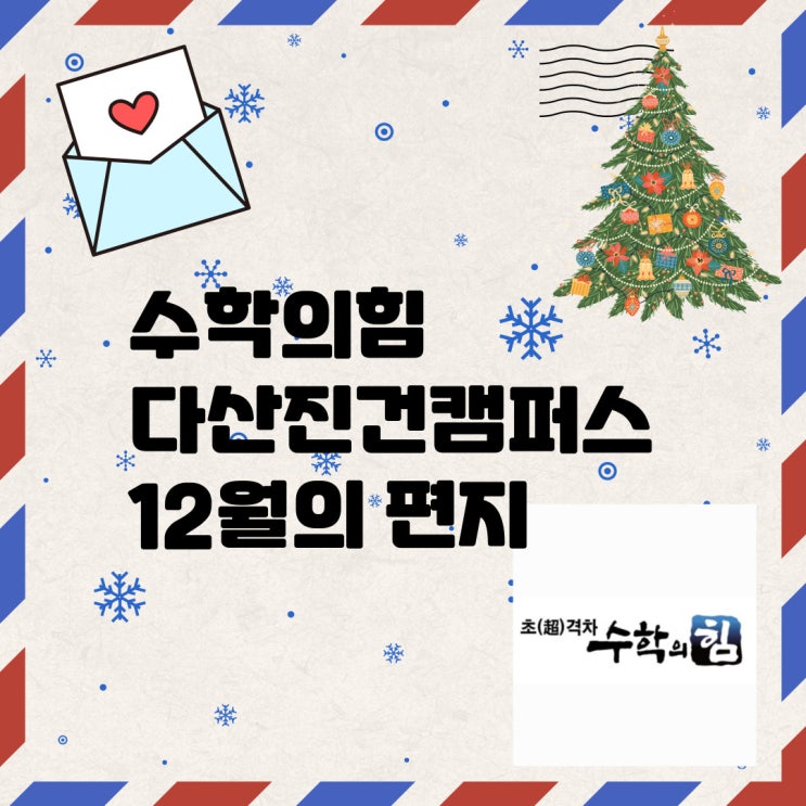 ◆ 12월의 편지와 겨울학기 개강 소식입니다. 안녕하세요. 수학의힘 다산진건캠퍼스 원장입니다. 어느덧 한 해를 마무리하는 12월을 맞이했습니다. 12월에는 우리학원의 부모님들과 학생들이 더 행복했으면 좋겠습니다. ^^ 우리 학원의 부모님들과 학생들에게 12월의 편지와 겨울학기 개강 소식을 전해드리겠습니다. ◆ 대표 원장이 보내드리는 12월의 편지입니다. 좋은 학원은 부모님들께서 자녀를 보내고 싶은 학원이고 학생들이 다니고 싶은 학원입니다. 교육자로서 키우고 싶은 아이는 <자존감이 높은 아이, 배려심이 깊은 아이, 타인을 존중할 줄 아는 아이, 독립심이 강한 아이>입니다. 가장 좋은 교육은 아이의 자존감을 높여주는 것....... <img src="https://blogthumb.pstatic.net/MjAyNTEyMDFfMTU1/MDAxNzY0NTczOTc3ODYx.Bl2PPxCeAB5LaNK-WIMi6AEWv_8elUHec-Kjb0sxBaQg.MmlRYslfP1o1TLtxtf21jmKKLCK2oVS0p5v3pV6HeGsg.JPEG/%C1%A6%B8%F1%C0%BB-%C0%D4%B7%C2%C7%D8%C1%D6%BC%BC%BF%E4_-001_%2861%29.jpg?type=s3" />