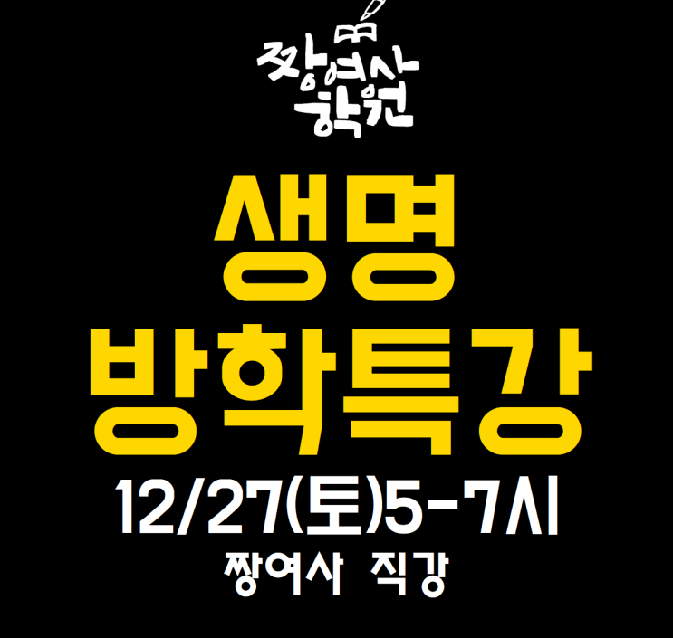 ✨ 예비고1 겨울방학 생명과학 한바퀴 완성반 토요일 5–7시 / 12월 27일 개강 – 2월 28일 종강 / 총 10주 완성 중학교 과학을 탄탄히 공부해 온 예비고1 학생들은 겨울방학을 어떻게 보내느냐에 따라 시험의 난이도 체감이 완전히 달라집니다. 특히 물리·화학 선행이 끝난 학생들은 생명과학까지 구조적으로 정리해 두면 3월부터 바로 기출·내신 유형 훈련에 들어가며 1등급 확률을 극대화할 수 있습니다. 이번 겨울, 짱여사학원에서는 예비고1 학생들을 위해 생명과학 완전 한바퀴 완성을 목표로 하는 10주 집중 특강을 개설합니다. 왜 ‘예비고1 생명과학 선행’이 중요한가? 1) 시험의 난이도 편차가 크다 각 학교별로 출제 범위와 서....... <img src="https://blogthumb.pstatic.net/MjAyNTEyMDdfMyAg/MDAxNzY1MTA3MDE1Nzg5.b1Vfh_C_9utrewa2mhGtgFy9JbGr922Xko08ZSQfF8gg.KX25TQQ3jwjkbqxitvf-caK38_NWDYM7vJ6bj62ZG64g.PNG/2025-12-07_20_23_09.png?type=s3" />