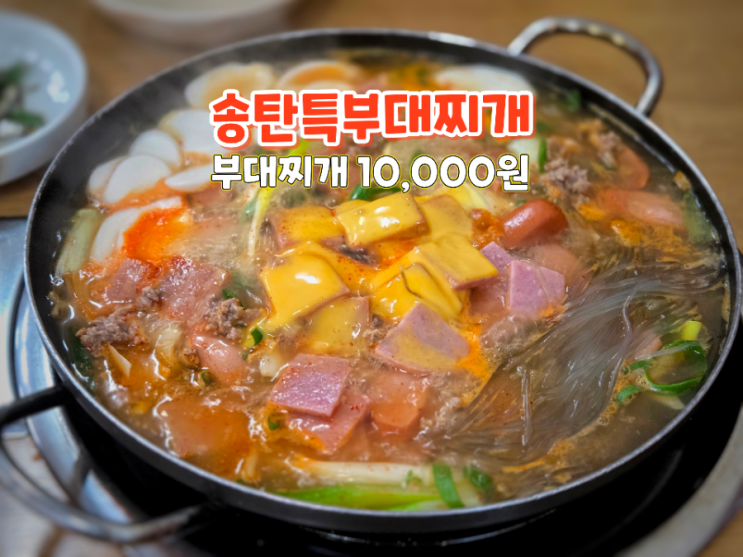 부평역 근처 가성비 맛집 송탄특부대찌개 소개합니다. 오래된 노포맛집이지만 내부는 상당히 깨끗합니다. 메뉴판 살펴봅니다. 부대찌개 10000원이에요. 청국장부대찌개 웬지 호기심이 땡기네요. 혼밥류도 팔지만 부대찌개가 대표메뉴입니다 송탄부대찌개 스타일답게 치즈 한장 딱 올라가있죠. 햄, 소세지, 떡국떡, 당면, 김치 콩나물 등이 들어갑니다. 뚜껑을 덮고 끓여줍니다. 반찬은 5종 나오는데 리필 가능해요. 계란찜 나와서 참 좋았어요. 계란찜도 리필이 되네요. 부대찌개는 팔팔 끓여줍니다. 국물이 졸을 때까지 좀 더 끓여줘요. 끓일수록 맛에 깊이가 더해갑니다. 끓는 중간에도 소세지 건져먹는 재미! 소세지가 상당히 고급집니다. 적....... <img src="https://blogthumb.pstatic.net/MjAyNTEyMTJfMjQ0/MDAxNzY1NTQxNTEwOTYz._XXrf8oVPgJ8YGz9tKSPe8F90zj4mEP8wKRh8psMnKkg.ibAudtBBQ97nFqVMTErkT9c7_7OMj5uTGbG2P7Qd28sg.PNG/900%A3%DFcu1765537395342.png?type=s3" />