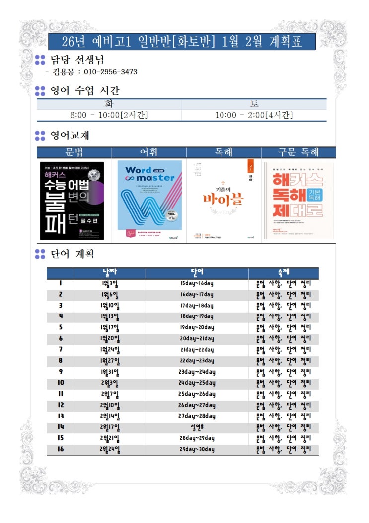 [예비고1/영어/김용봉T]2026.1-2월 수업계획표 (일반 화/토)