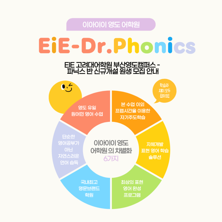 EiE + Dr. Phonics 파닉스 원생 모집 안내 안녕하세요! EIE 고려대어학원 부산영도캠퍼스입니다. 많은 학부모님들이 관심을 보여주셨던 파닉스 반이 드디어 개강합니다. 2026년 1월 부터 새롭게 개강하는 고려EIE만의 특별한 파닉스 반은 영어 기초를 튼튼히 다지고 싶은 학생들을 위해 EiE 프로그램과 Dr. Phonics 교재를 활용하여 학습과 재미 모두를 잡는 저희 학원만의 파닉스(Phonics) 수업이라고 자부 합니다. ✅ 이런 학생들들에게 추천합니다 알파벳, 소리, 기본 단어 읽기를 처음 배우거나 파닉스를 처음 시작하는 초등 학생 영어 단어를 읽고 쓰는 기본기를 탄탄히 다지고 싶은 학생 영어 발음, 읽기, 스펠링 등 영어 기본기를 차....... <img src="https://blogthumb.pstatic.net/MjAyNTEyMTBfMTA5/MDAxNzY1MzY2Mjc0ODU2.ebYZqVvZdOxSCI6_s6Zyyyen8e-nMmp7EgtB9LNCfuAg.jlnQ27fByE9-IvgjeOd0sBICUdjxvmL55h0p5CM9_LAg.PNG/%C1%A6%B8%F1%C0%BB_%C0%D4%B7%C2%C7%D8%C1%D6%BC%BC%BF%E4..png?type=s3" />