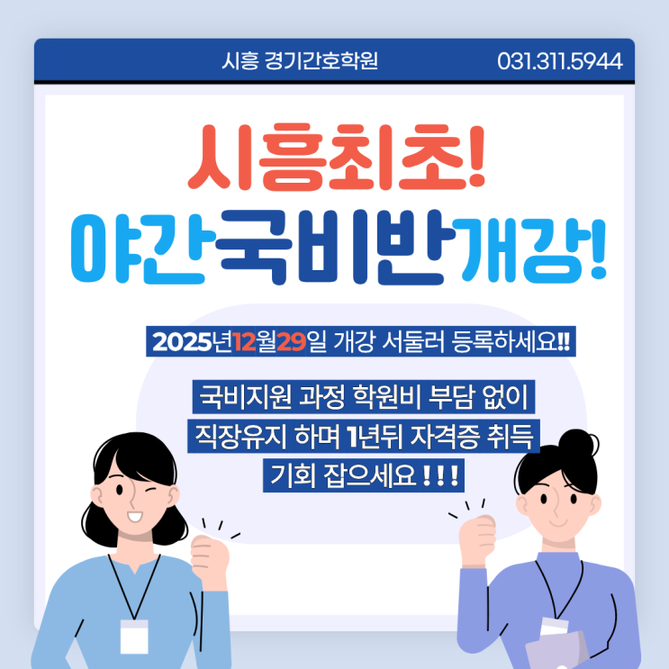 지금의 내가, 앞으로의 나를 바꾸는 순간 !!! 시흥에서 처음 개강하는 야간 국비반이 드디어 여러분을 기다립니다~~ 늦게 개강 확정되어~서둘러 주세요~~^^ 일하고, 알바하고, 집에 돌아오면 ‘나 진짜 이대로 괜찮을까?’ 생각 한 번쯤 해본 적 있죠? 직장은 유지하면서 학원비는 국비로 지원받고 1년 뒤 자격증까지 준비할 수 있는 이런 기회… 사실 흔하지 않아요. 그리고 어쩌면 이번이 내가 진짜 하고 싶은 일을 찾을 수 있는 첫 번째 계기일지도 모릅니다~^^ ⏰ 지금 아니면 또 1년을 기다려야 합니다. 조금만 늦어도 마감되는 자리입니~~~다. “언젠가” 말고 지금의 나에게 투자하는 그 순간, 여러분의 1년은 완전히 달라....... <img src="https://blogthumb.pstatic.net/MjAyNTEyMTFfMjY3/MDAxNzY1NDU4OTU1MDg4.QeDY2Ve6s5Sxah_4bhzSk-MsNVAWJ97kmBkXVzqfQRMg.sGNRyVyaTc23FCdivnjR32lmXP3X3nA1P8CRlKa6U3wg.PNG/1.png?type=s3" />