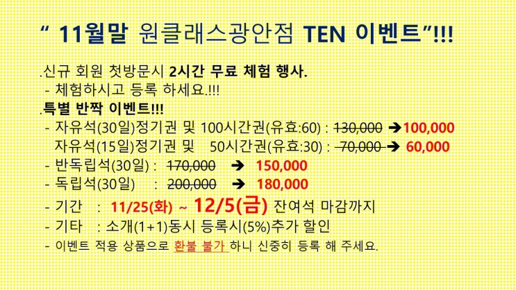 11월25일부터 원클래스독서실 광안점 특별 이벤트!!!